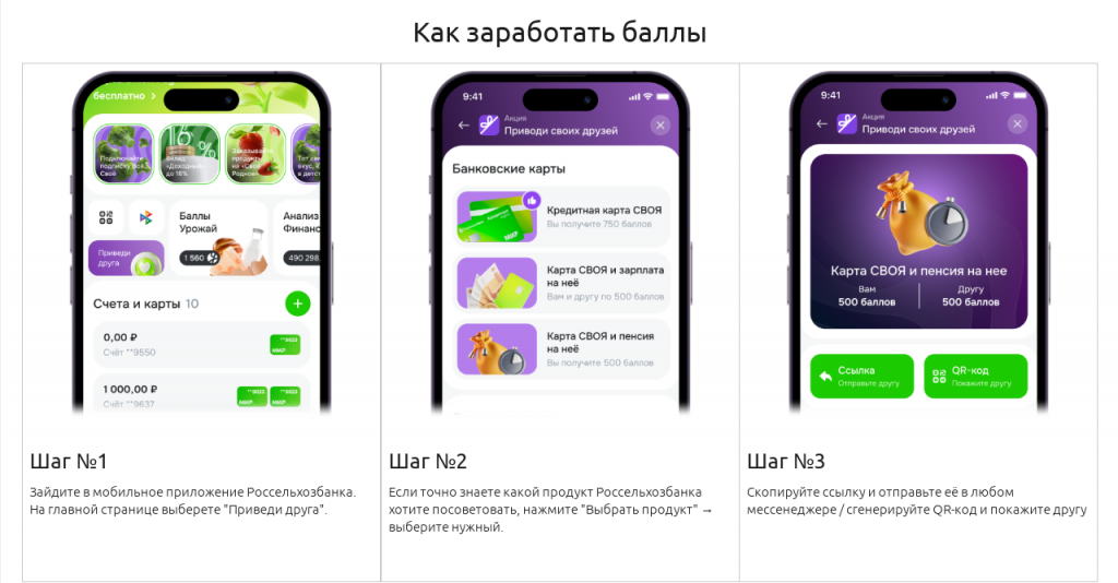 Для участия в программе клиенту РСХБ достаточно зайти в раздел «Приведи друга» в ДБО (сервисе дистанционного банковского обслуживания), получить персональную ссылку или QR-код и передать его друзьям. Начисление бонусных баллов происходит в течение 30 дней с момента выполнения другом условий программы.