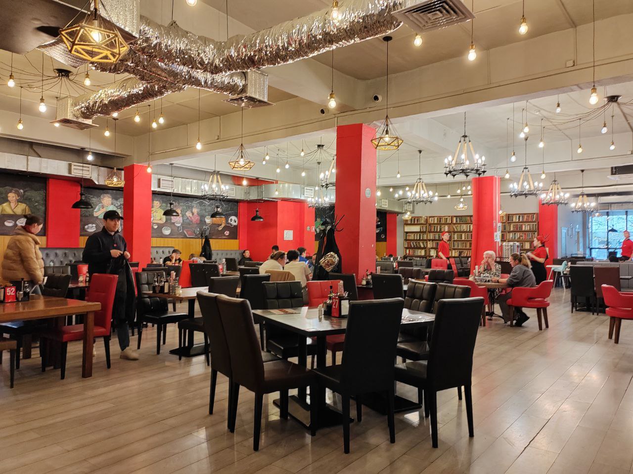 Во-первых, мы случайно наткнулись на местную фирменную лагманную. Интересное заведение с большим выбором национальных блюд, которое совершенно неожиданно оформлено в стиле советских квартир зажиточной интеллигенции. Вдоль стен просторного зала в классическом стиле стоят книжные стеллажи и шкафы, ломящиеся от книг советской ещё печати: тут и узнаваемые потрепанные корешки серии ЖЗЛ, и томики русских классиков с тиснением под золото… Читающих мы среди посетителей не заметили, но выяснили, что любую книгу в принципе взять почитать можно. А у нашего столика обнаружился даже томик Шишкова — и шаркнула по душе нотка ностальгии по Алтаю.