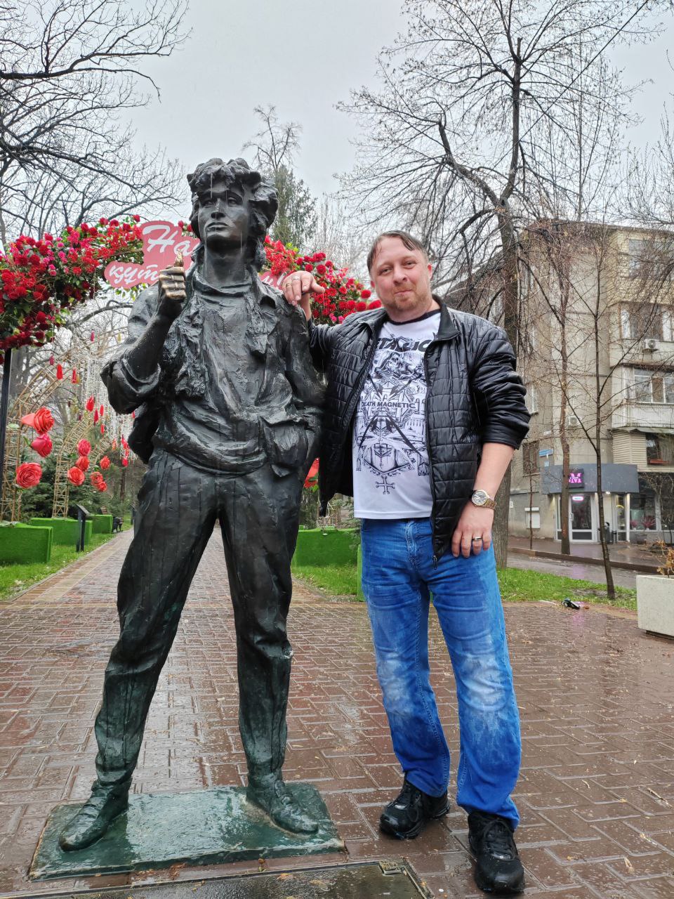 А во-вторых, мы также случайно столкнулись с… Виктором Цоем. Ну, не лично с ним, а с его скульптурным изображением. Строго говоря, это даже не сам Цой, а его киношный персонаж из культового фильма «Игла». Он застыл навеки за минуту до гибели, чиркая зажигалкой на аллее улицы Тулебаева. Кстати, скульптура установлена ровно на том месте, где снималась финальная сцена «Иглы».
