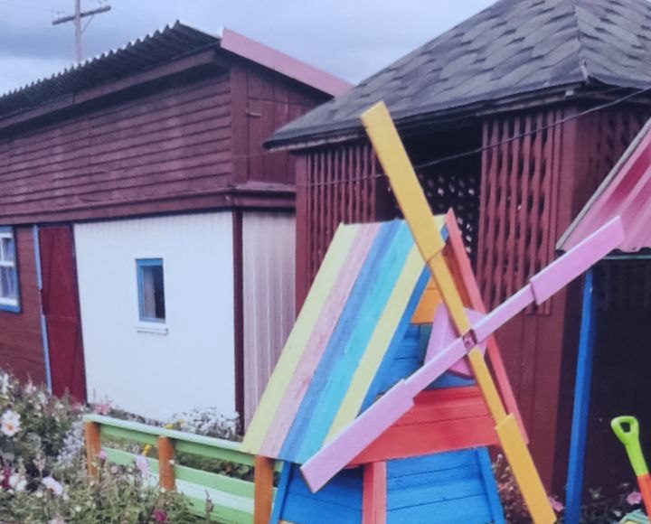 — Это мы с мужем мастерили все своими руками. Делали все заготовочки зимой в доме. Нарезали палочки и плели тын. Ну, где-то полмесяца на это ушло. Затем делали грибочки. Мы пошли по соседям. У нас были колотые дрова, и вот мы их меняли на пеньки. Потом- опятки. Мы их делали разного размера. Маленький, большой. Затем я их покрасила. Вот этого мишку тоже делали зимой в доме. А этот кораблик муж построил мне в 2016 году. Старался, все лето делал. Лебеди у нас из колёс. Их я красила белой красочкой. Тоже очень тяжело было. Выворачивать колеса очень трудно. Потом говорю, Коль, давай сделаем мельницу-ветельницу. Говорит-давай! Посмотрели в журнале, как она делается. Муж у меня очень кропотливый, качественно все делает, старается, чтобы было красиво. Да у нас вообще и бочки, и кастрюли, и ведра, и калоши- все в ход идет. Земли насыпали, цветочки посадили — вот и клумба, и вещи старые пристроены. В следующем году у нас намечается юбилей села. Мы с мужем готовимся, уже делаем поделки из подручного материала.