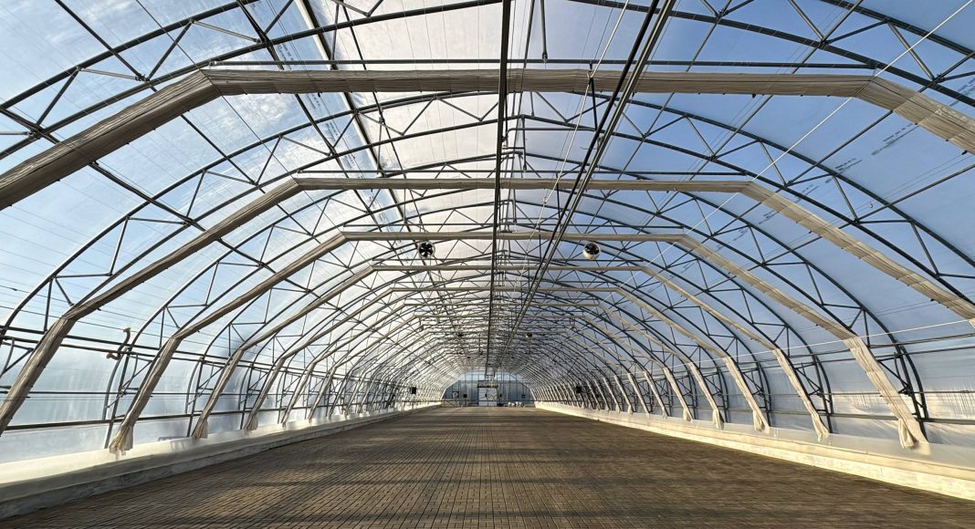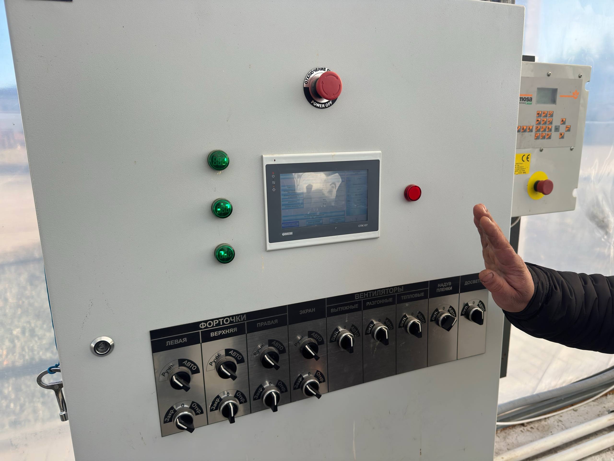 В теплице установлено автоматическое затенение, постоянно мониторится температура снаружи и внутри помещения, скорость ветра. Метеостанция считывает, сколько энергии солнечных лучей поступает в теплицу и если они превышают допустимый показатель, начинается затенение, происходит автоматическое зашторивание. Также здесь имеются форточки для вентиляции. Когда температура воздуха в теплице повышается, они автоматически открываются, включаются разгонные вентиляторы.