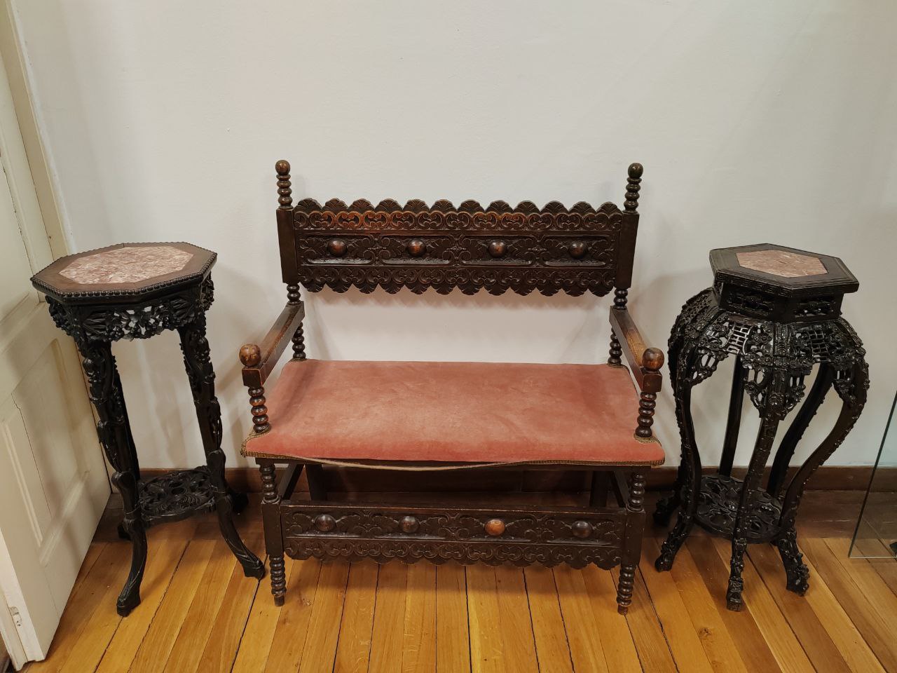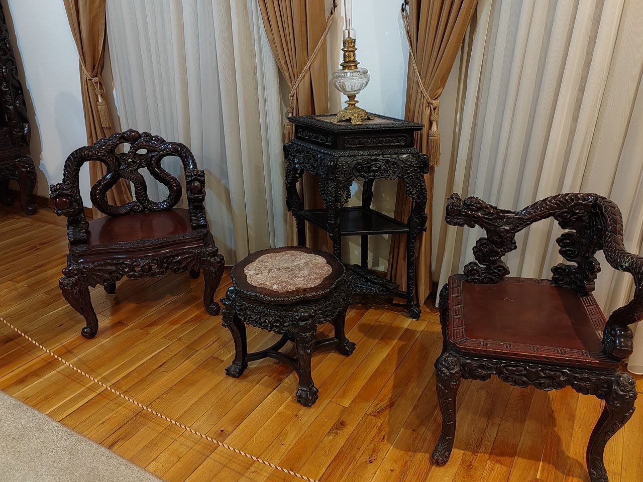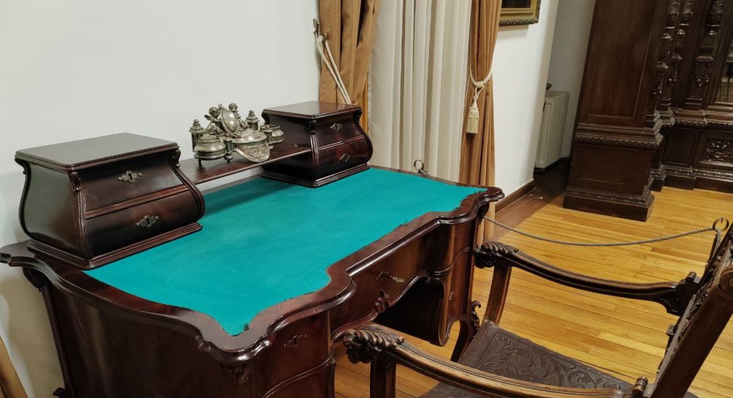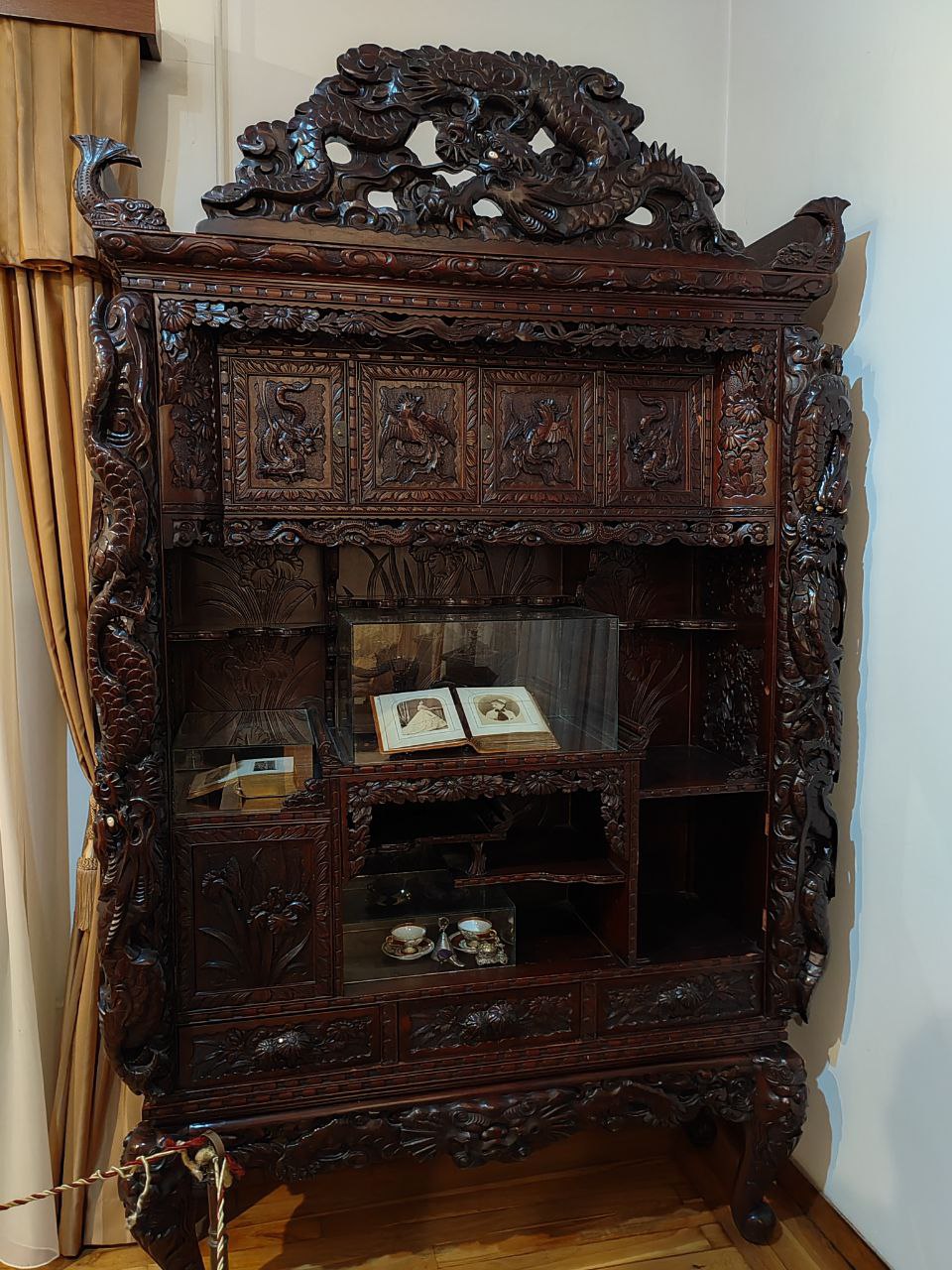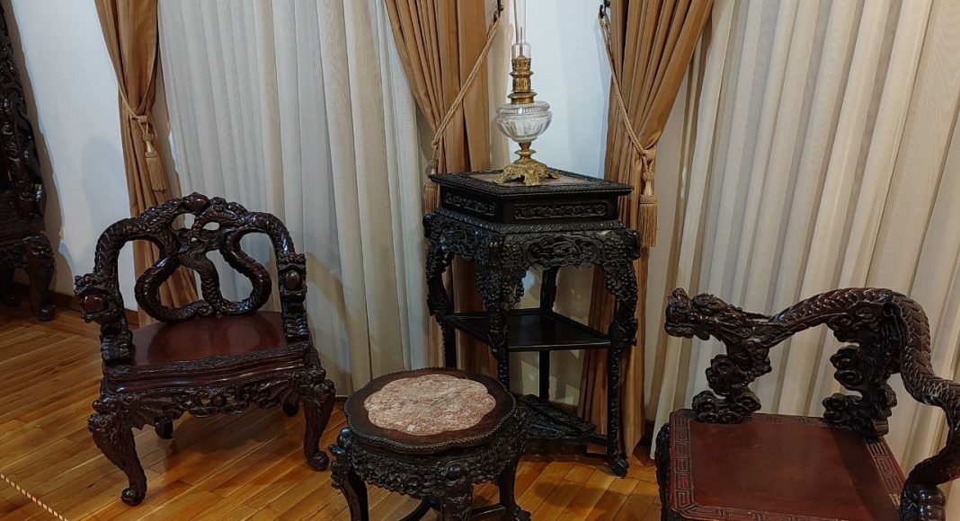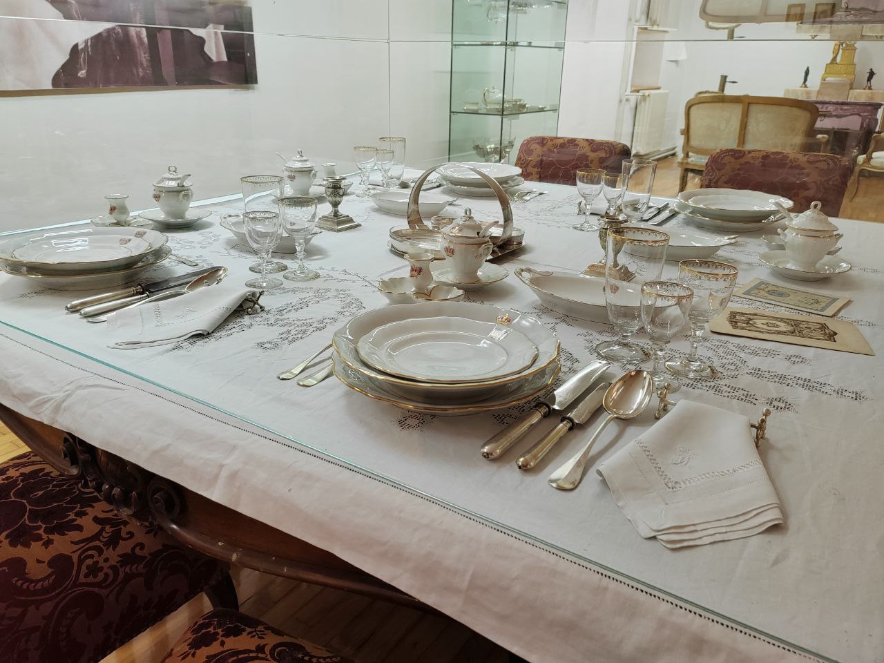 Время здесь застыло. Сервированный стол в столовой, потертые кожаные кресла, внушительные деревянные дорого-богатые секретеры, письменные столы, дамские платья, мужские фраки и военные мундиры, из которых вынули людей — такое ощущение, что отсюда просто все куда-то вышли и скоро вернутся.