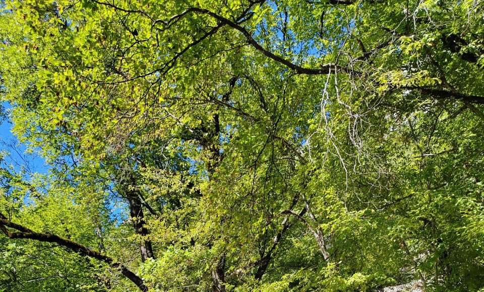 От места, где кончается автодорога, до верхнего монастыря ещё топать вверх по зигзагу лестницы на высоту, эквивалентную тридцати этажам. Тяжело, но очень живописно: мощёная ступенчатая дорога идёт через густой смешанный лес, которым зарос бок горы Острог, давшей название сооружению.