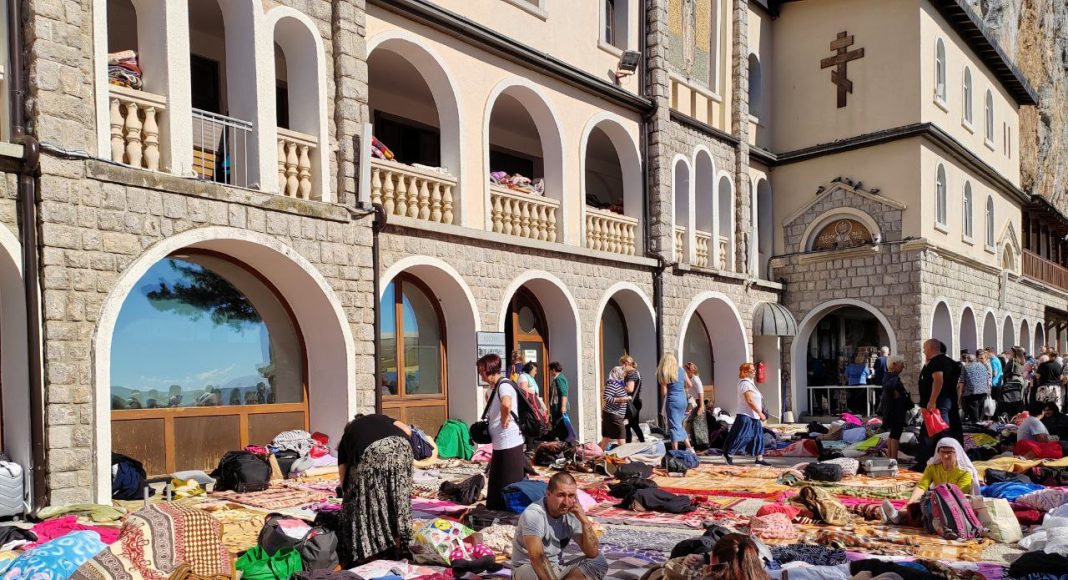 Мы попали в Острог в день какого-то крупного религиозного праздника, поэтому вся площадь и внутренний двор были застланы скитами паломников. На скитах сидели или лежали сотни людей, убежденные, что сакральность этого места улучшит настройки их жизней. По этой причине мы не попали внутрь монастыря — очередь была просто безумно длинной.