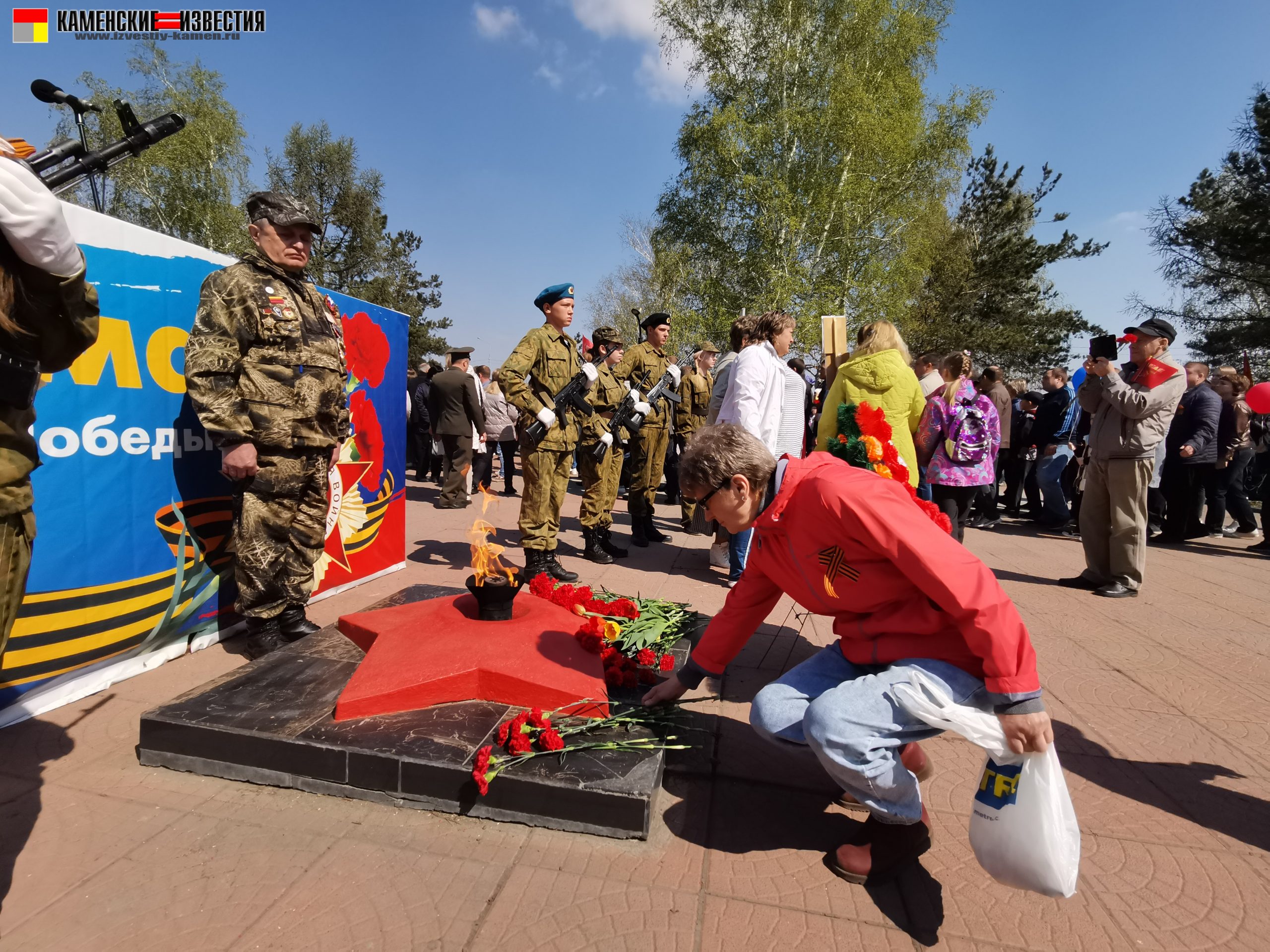 Ближе к 11 утра по улице Пушкина вереницей потянулись жители и гости города к мемориалу Славы. Именно здесь в назначенное время состоялся вынос Государственного флага Российской Федерации и знамени Победы. Затем Иван Панченко, глава Каменского района торжественно открыл митинг, посвященный 77-й годовщине Победы в Великой Отечественной войне.