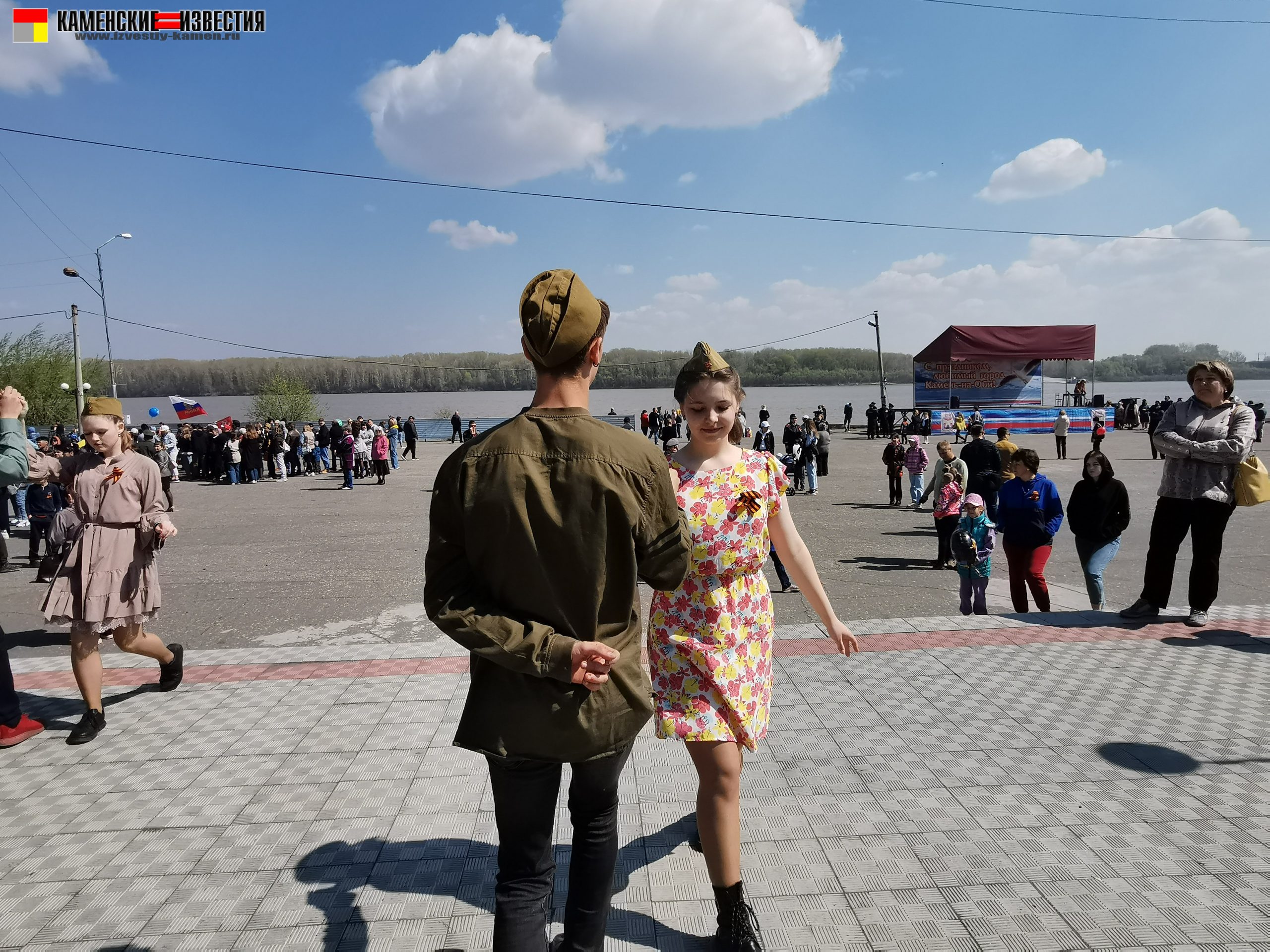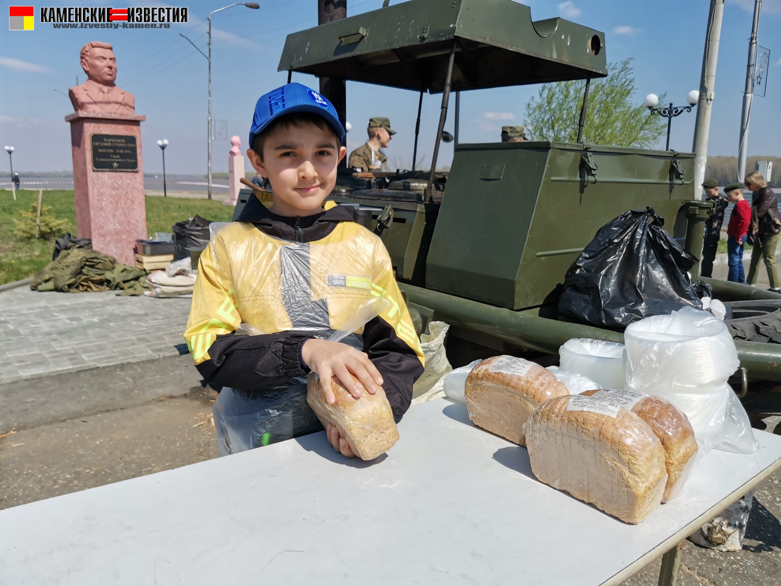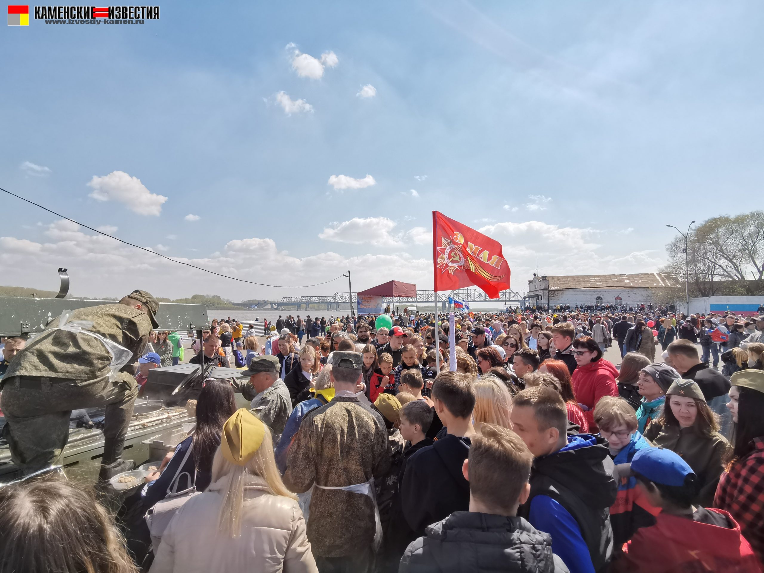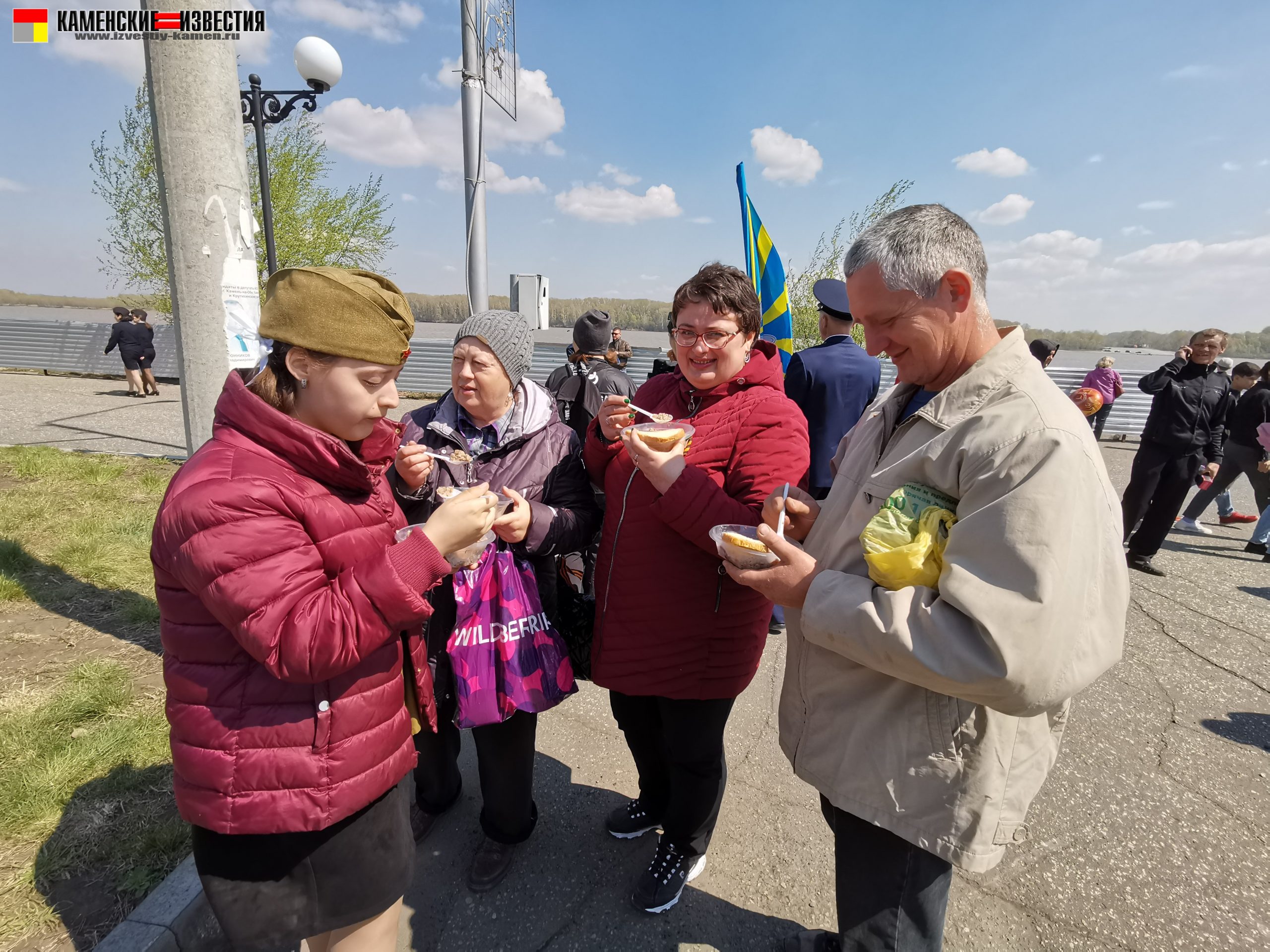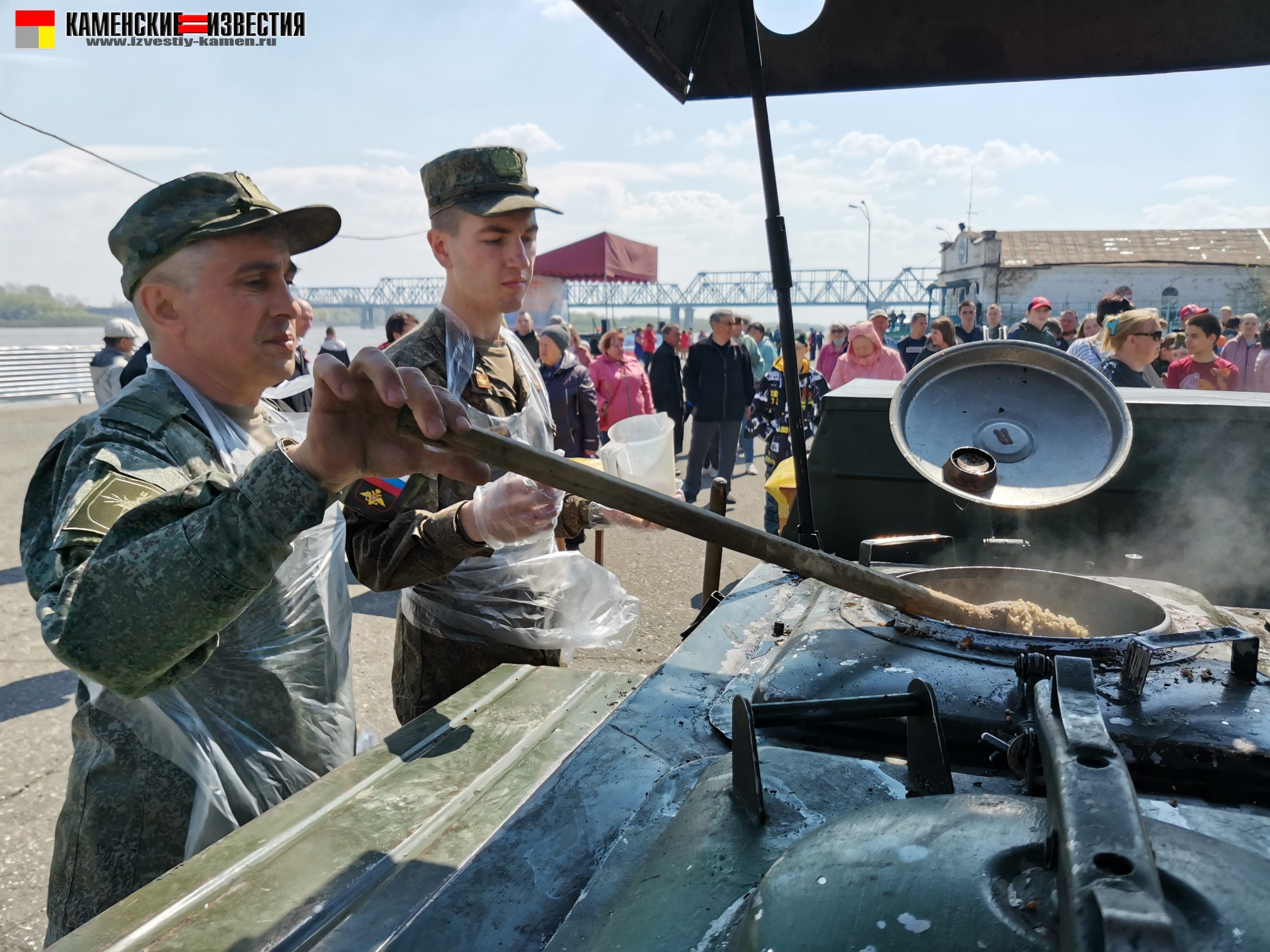 Пока на мемориале Славы проходил Парад, на набережной Оби военные готовили гречневую кашу и чай. Кстати, военная полевая кухня стала уже неотъемлемой частью Дня Победы в Камне-на-Оби. Горожане всегда с удовольствием пробуют гречу с кусочком хлеба и выстаивают за угощением огромные очереди. Говорят, что в этом году она была очень вкусная, с тушенкой и грибами. Кроме полевой каши, для зрителей работники культуры подготовили концертную программу «Споем вместе о победе», которая началась с того момента, как на ступенях набережной появились первые участники «Бессмертного полка». Здесь же было организовано несколько площадок с театрализацией. Одна группа молодежи играла роль полевого госпиталя и перевязывала раненых, другие танцевали вальс, третьи отдыхали после боя под звуки аккордеона, а четвертая группа работала с военными документами. На празднике скучно не было даже маленьким детям. Для них работал боди-арт, можно было посетить городской парк культуры и полакомиться сладкой ватой.