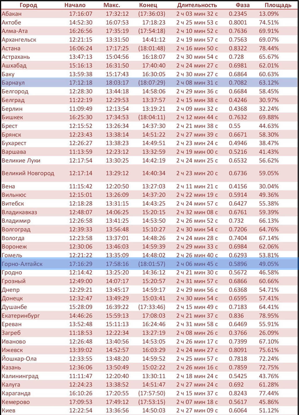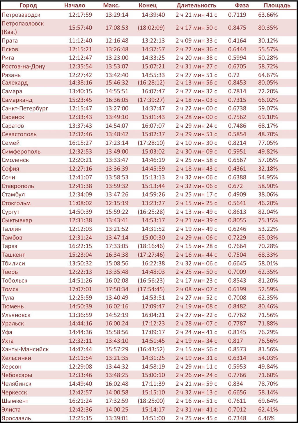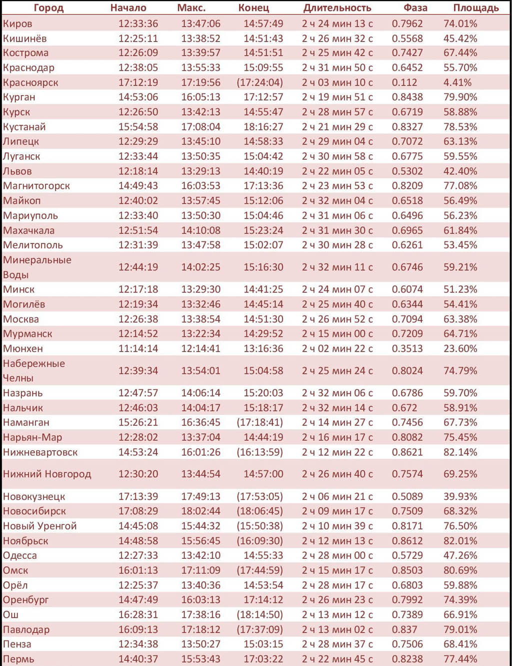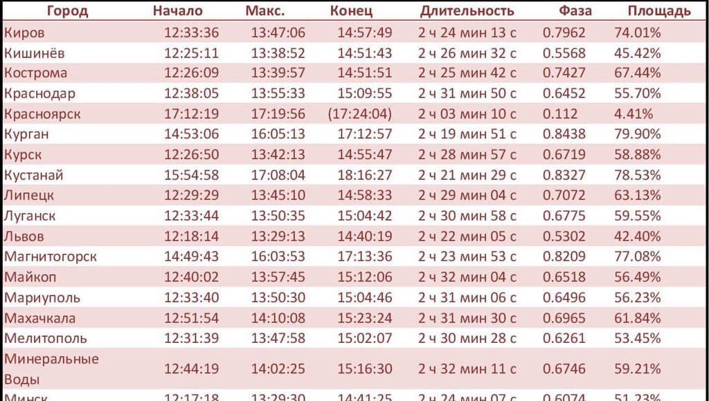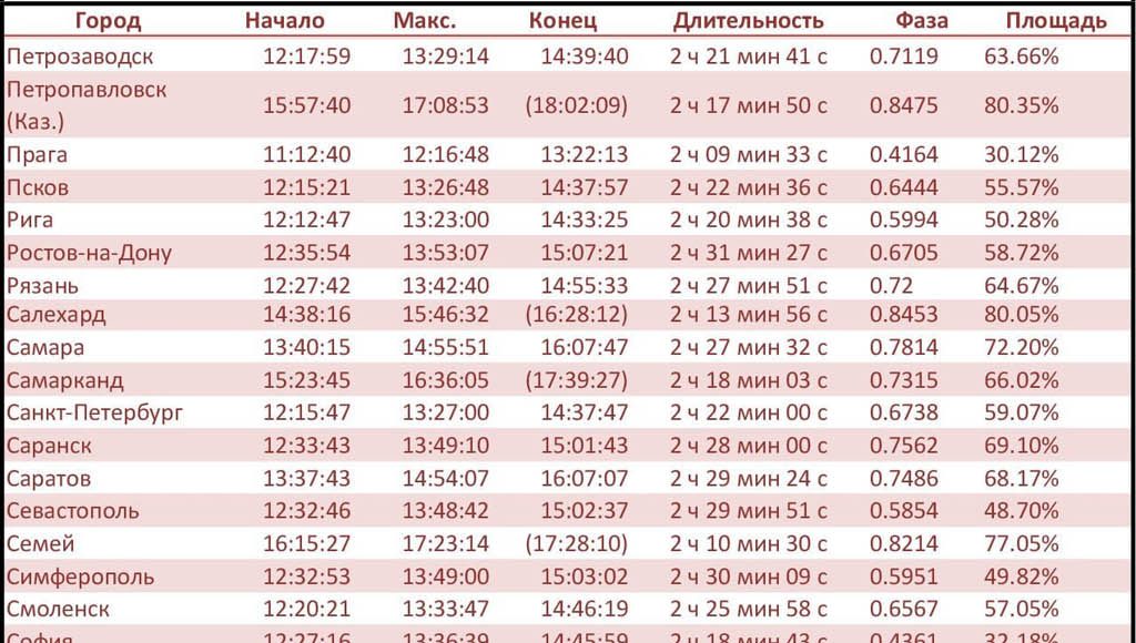 В таблице указаны время начала, максимальной фазы и конца затмения. Время в скобках указывает время заката Солнца, а не фактического окончания затмения. Также указаны полная длительность затмения, максимальная фаза и площадь солнечного диска, закрытого Луной, для каждого города. Данные взяты с сайта timeanddate.com. Внимание: время для каждого города указано местное, с поправкой на часовые пояса! А т.к у нас сегодня погода ожидается хорошей, то вы сможете в полной мере лицезреть это природное явление.