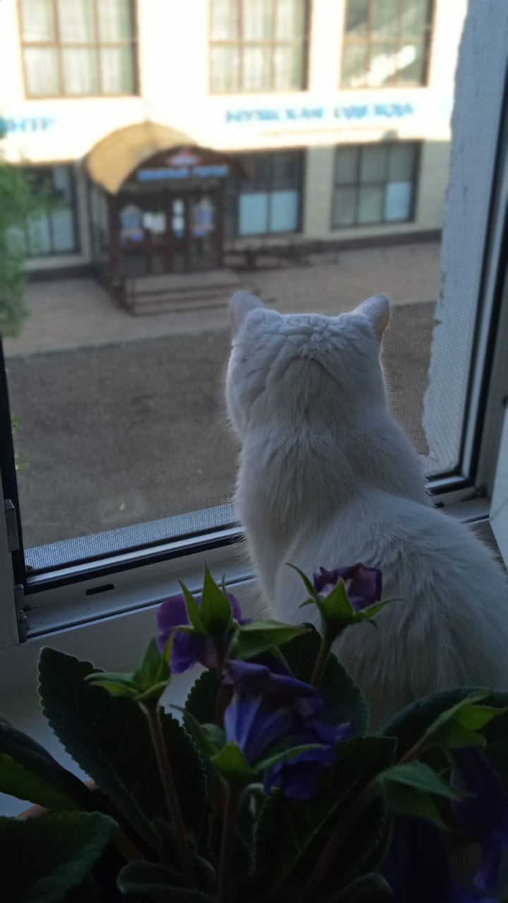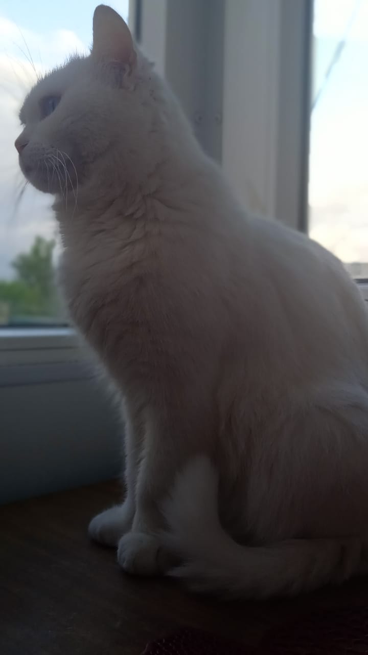 Здравствуйте! Это Муся, наша любимица. Появилась в нашем доме благодаря моей племяннице Соне, которая не могла пройти мимо пушистого белого комочка, найденного на улице. Муся привередливая в еде и не ест рыбу, молоко и сметанку, как все кошечки. Но любит пить воду из под крана и обожает смотреть в окно.