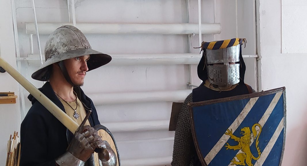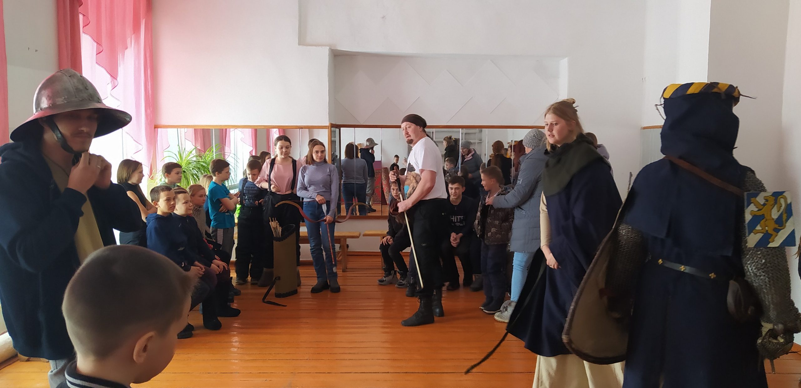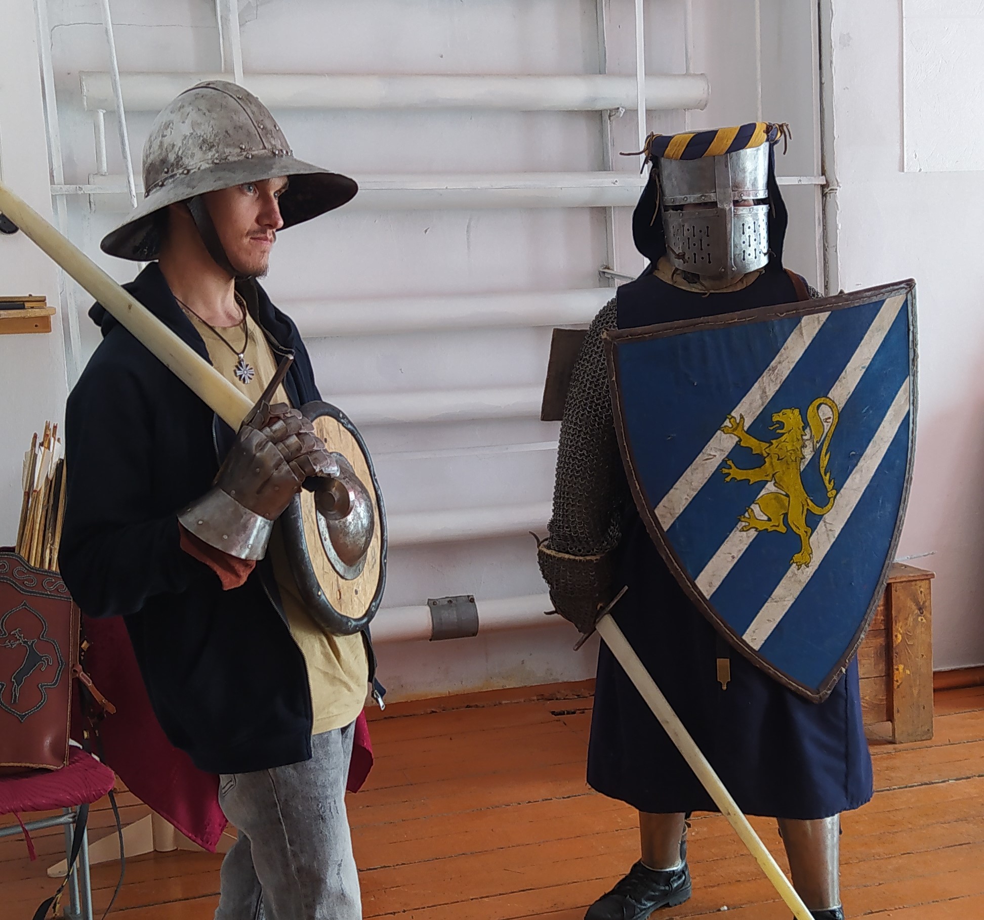 Помимо захватывающего рассказа о жизни в 13-14 веках, руководитель клуба Алексея Булгаков продемонстрировал боевое снаряжение, гражданские костюмы и предметы быта эпохи высокого средневековья. У желающих была возможность примерить некоторые элементы снаряжения на себя.