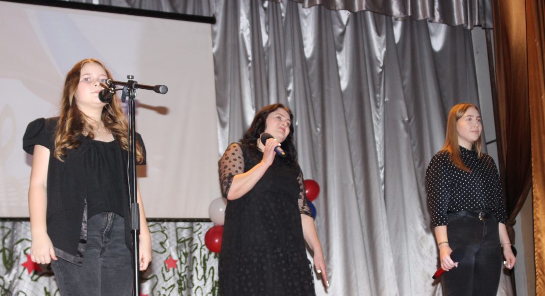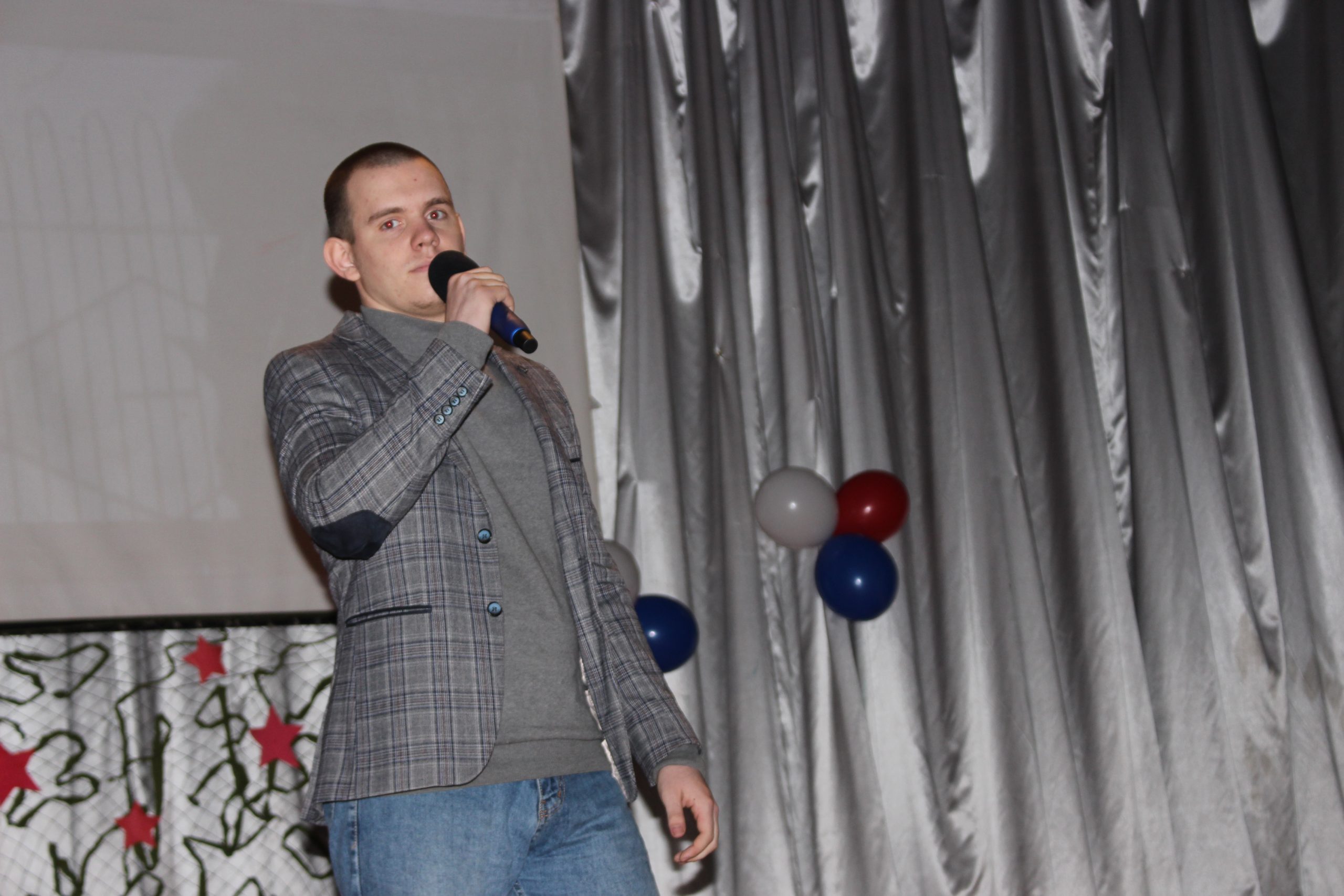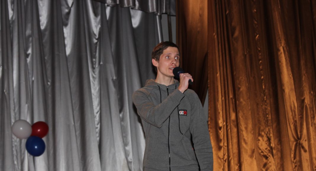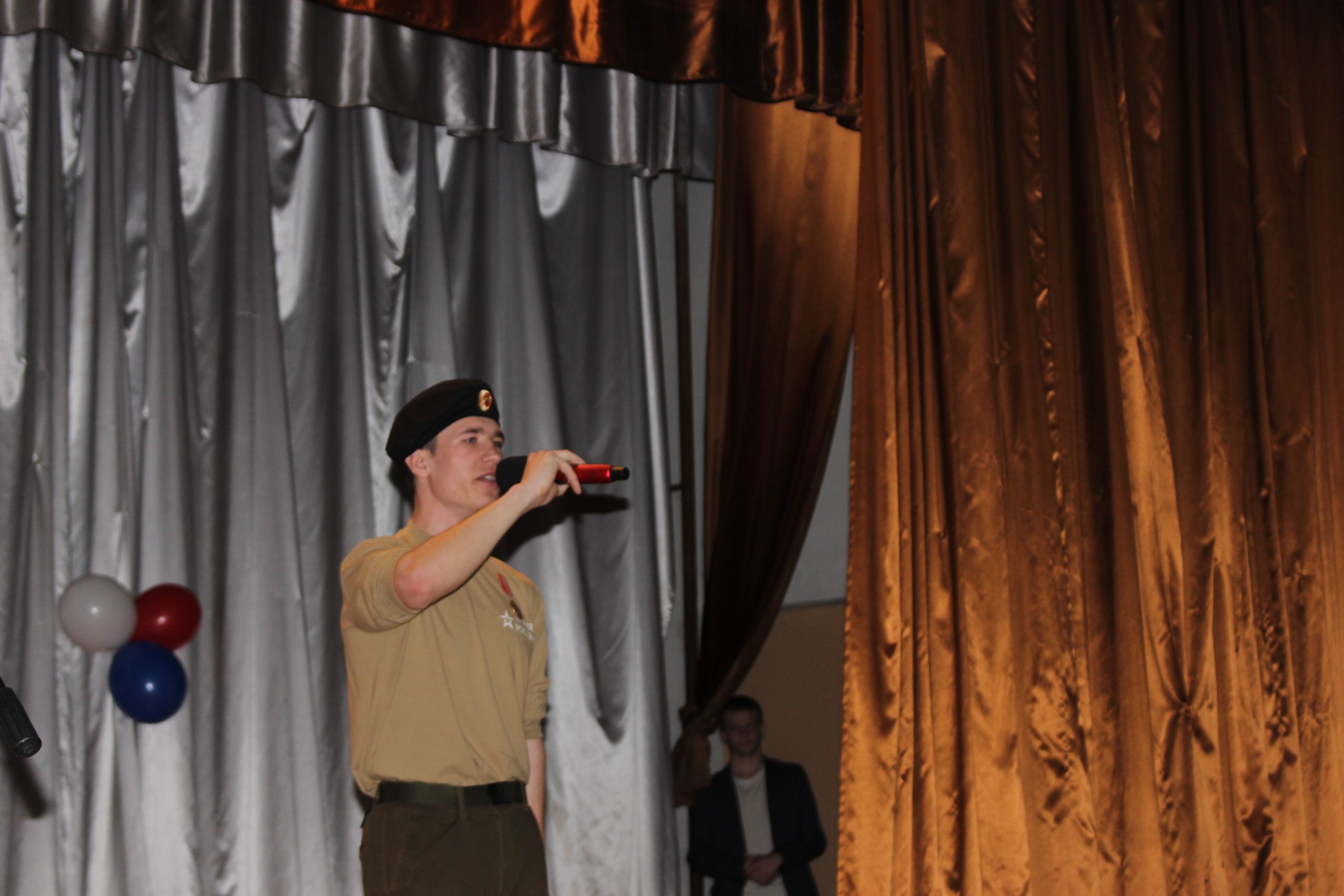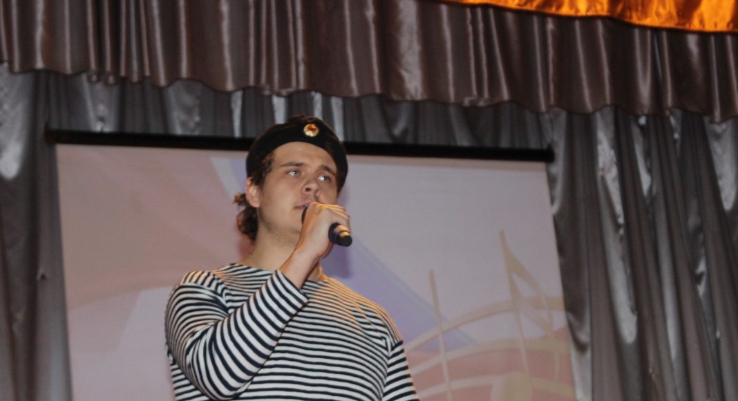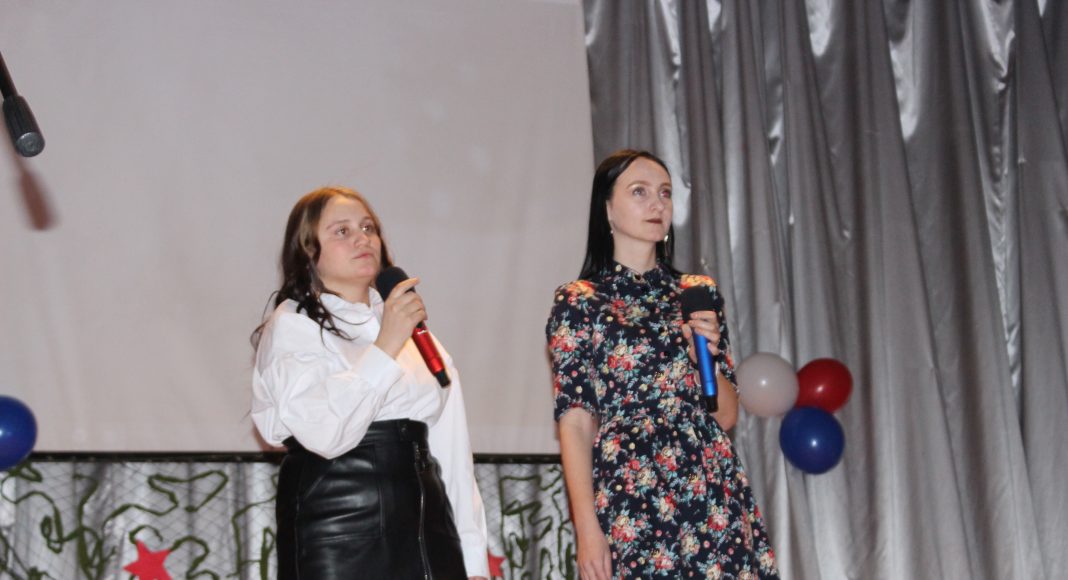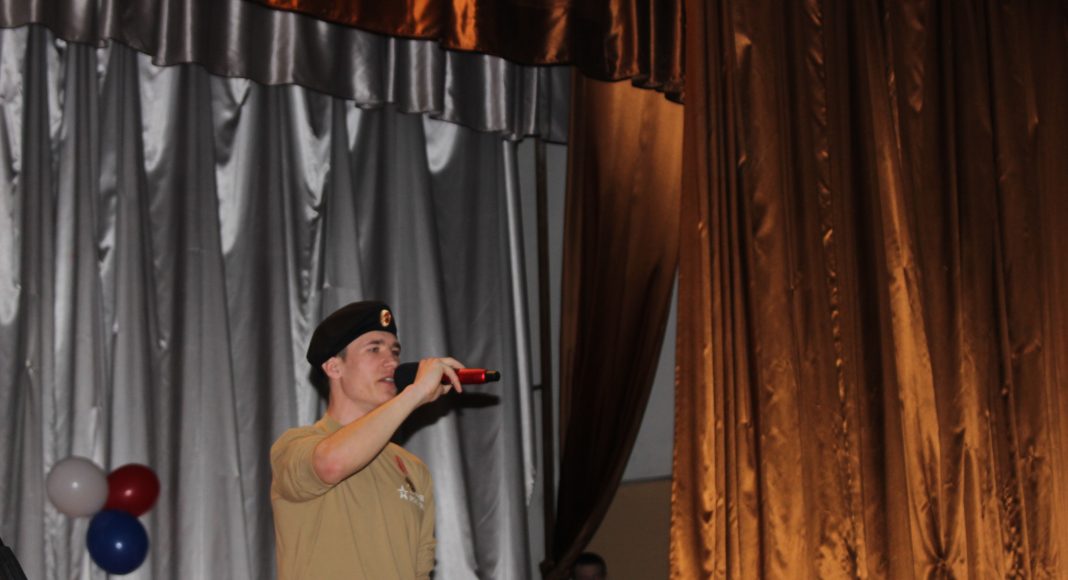 Хочется отметить, что в актовом зале не было свободного места. Прибывавших к началу концерта зрителей размещали на вновь и вновь принесенных стульях и лавках. Шум и гам в помещении прекратился, когда зазвучал гимн Российской Федерации, на сцену торжественно был вынесен флаг России. Ребята из военно-патриотического объединения «Афганец» своим ярким выступлением начали конкурс.