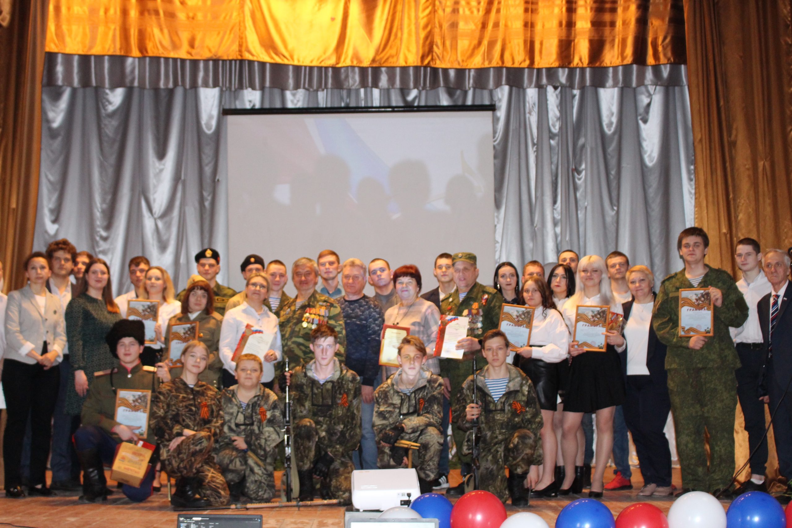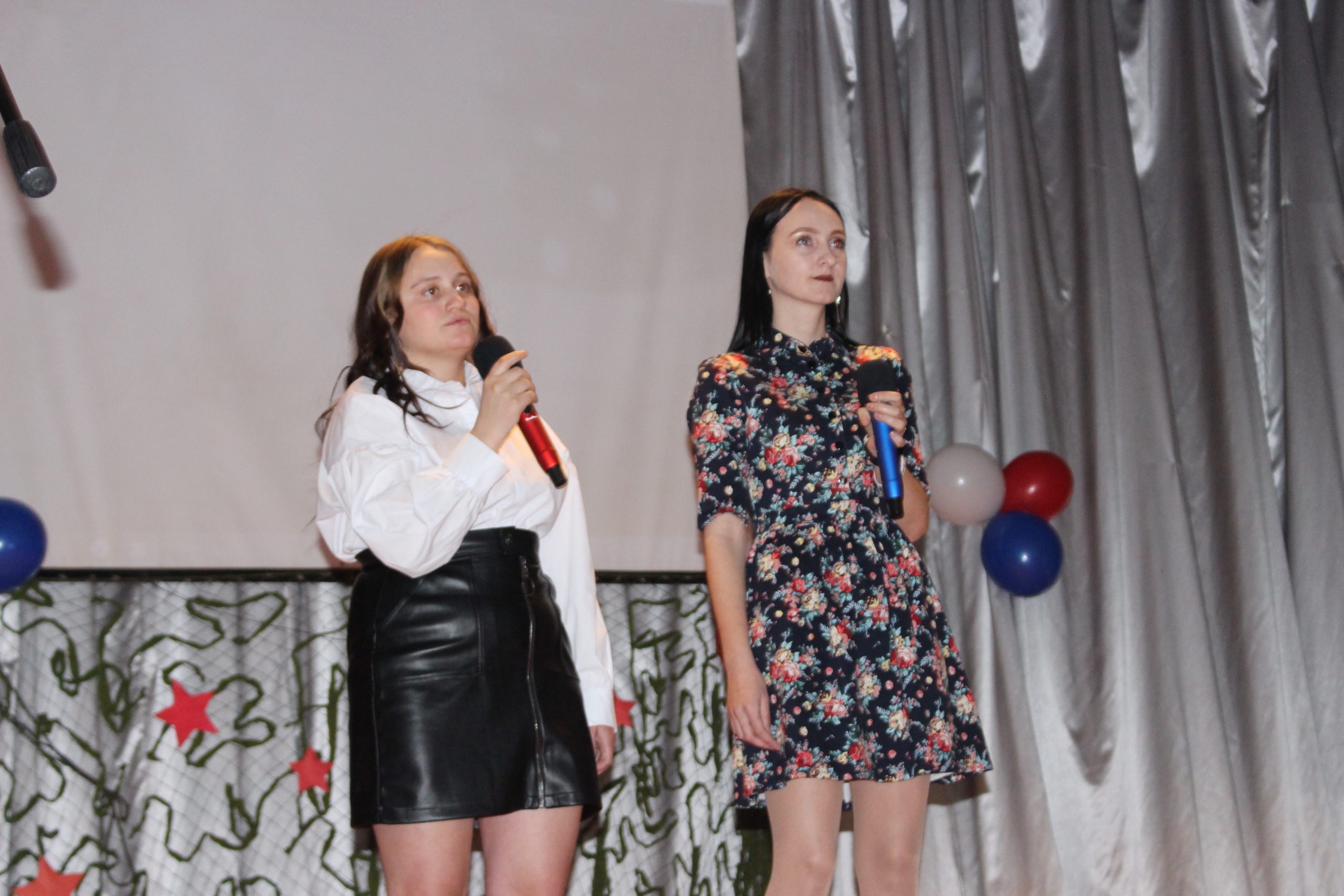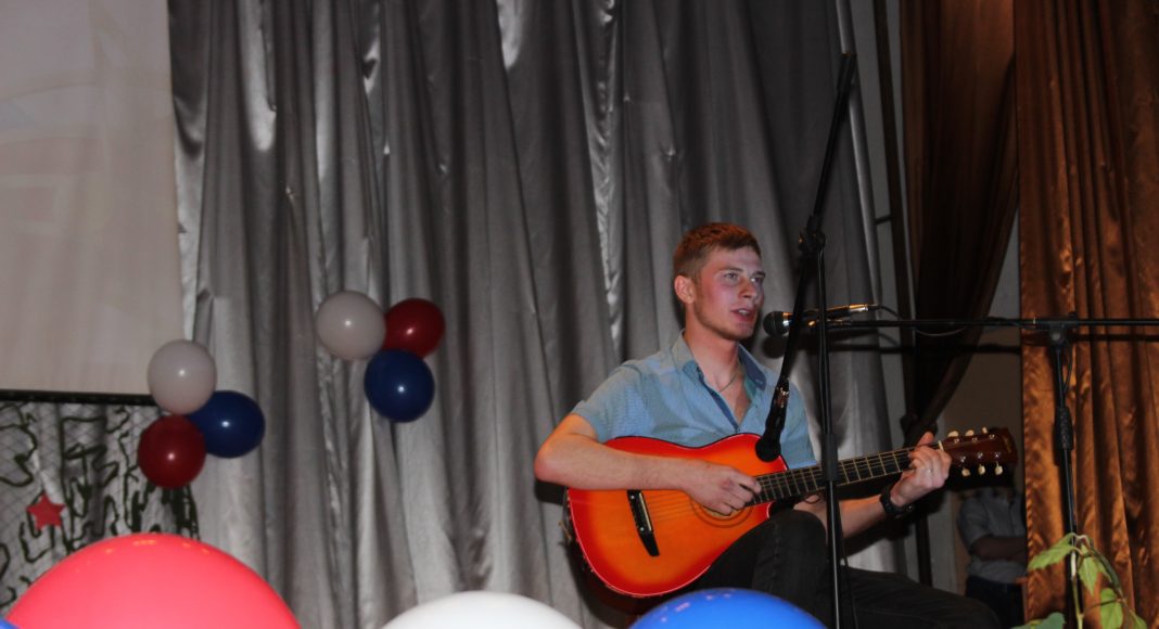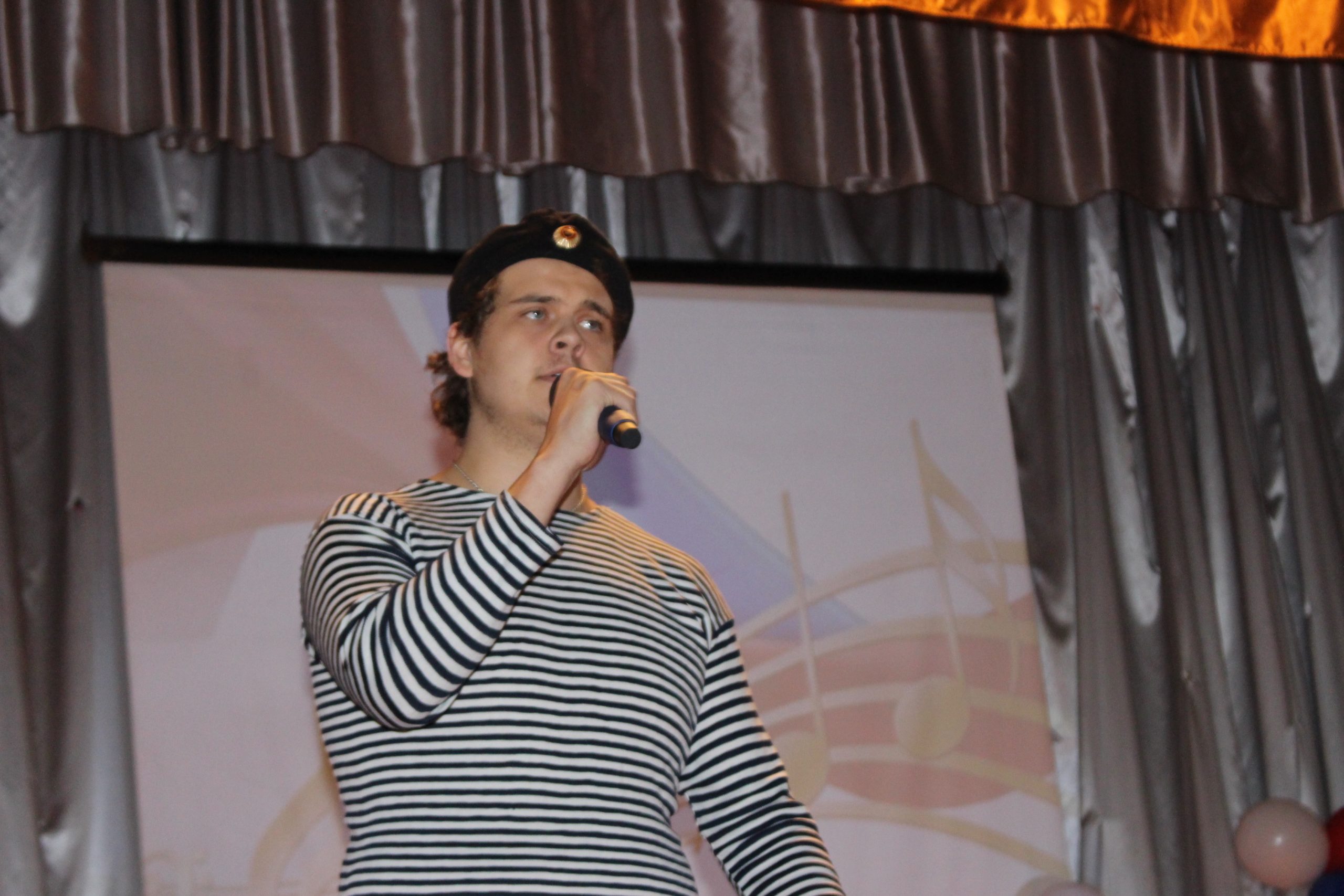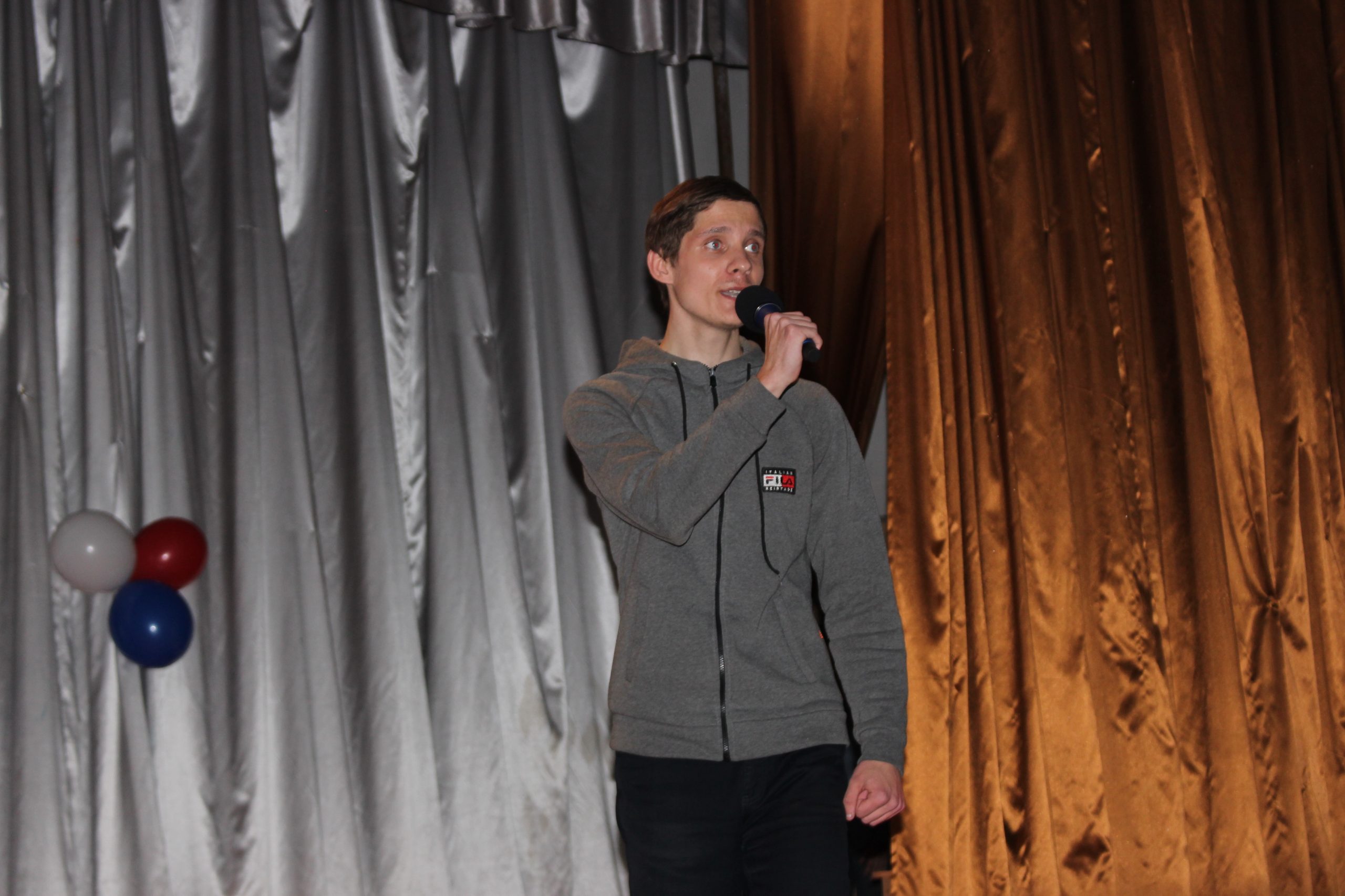 Хочется отметить, что в актовом зале не было свободного места. Прибывавших к началу концерта зрителей размещали на вновь и вновь принесенных стульях и лавках. Шум и гам в помещении прекратился, когда зазвучал гимн Российской Федерации, на сцену торжественно был вынесен флаг России. Ребята из военно-патриотического объединения «Афганец» своим ярким выступлением начали конкурс.