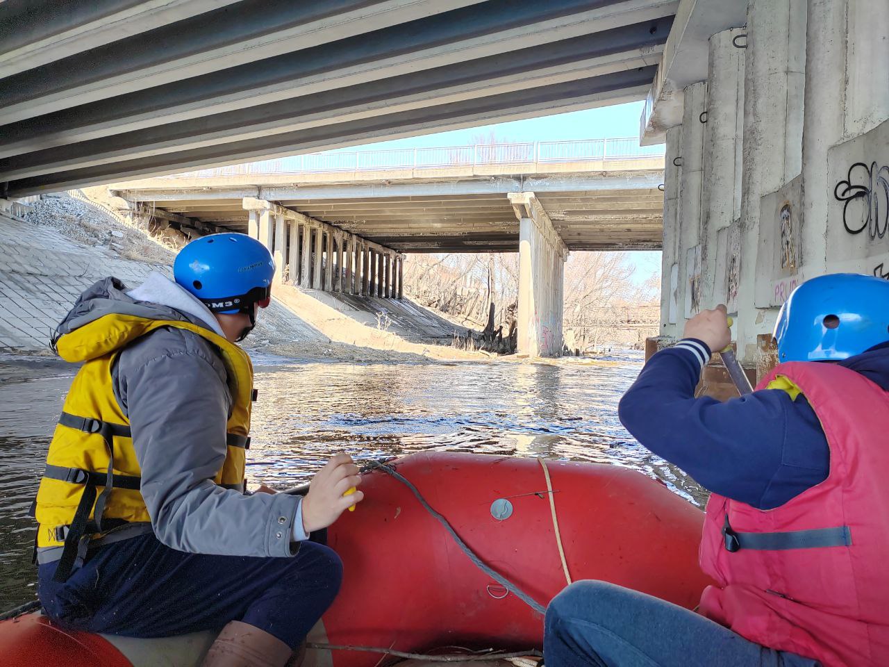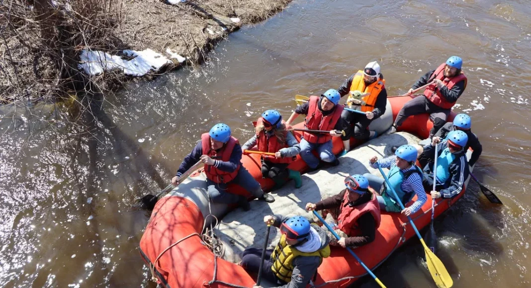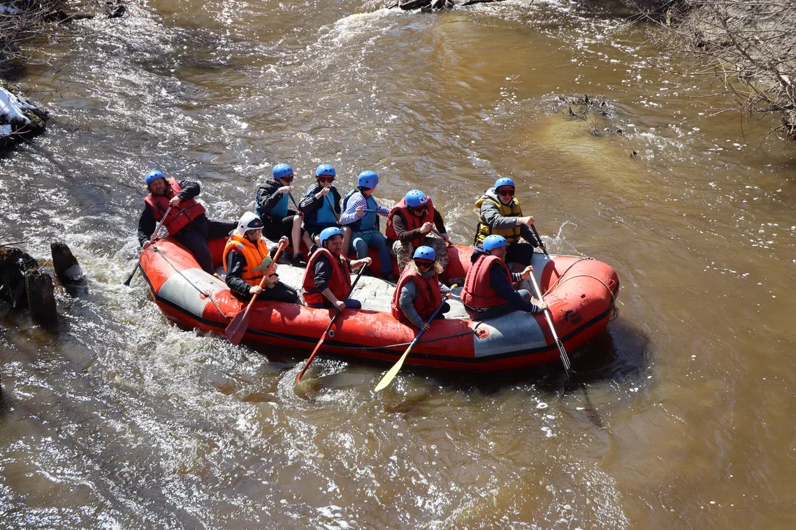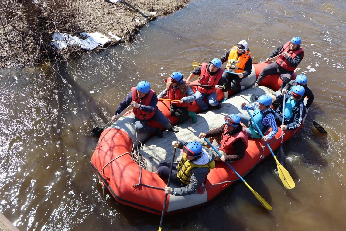 Итак, мизансцена за десять минут до старта, недалеко от места, где Пивоварка и Барнаулка заключили вечный пакт. Рафт (надувное судно, специально «заточенное» для сплавов) мирно покоится на берегу и ждёт своего часа. Ветераны сплава инструктируют новичков, помогают облачиться в спасательные жилеты, раздают защитные шлемы (они потом часто спасали нас от ссадин и шишек), дают краткий инструктаж по технике безопасности. Собственно, инструкции крайне просты: слушать команды капитана, то есть грести, когда надо, и не грести, когда не надо. Вот и вся премудрость рядового «матроса».