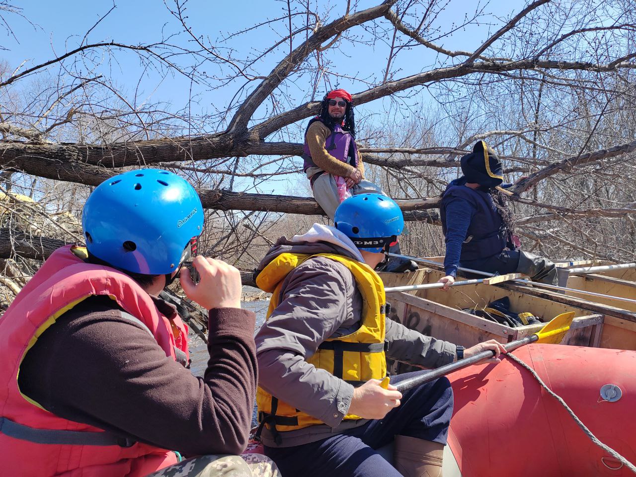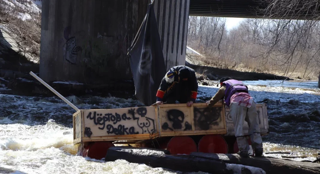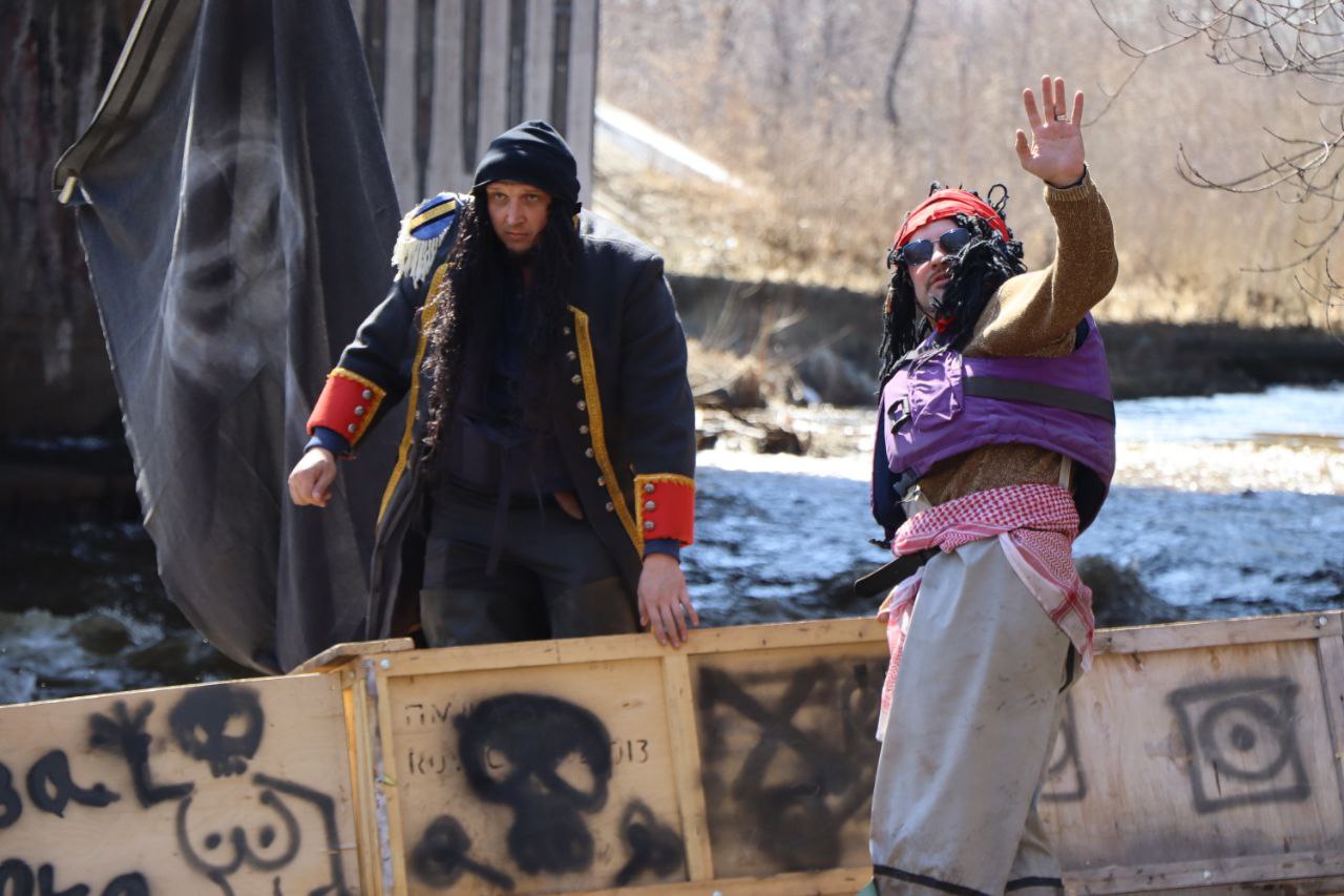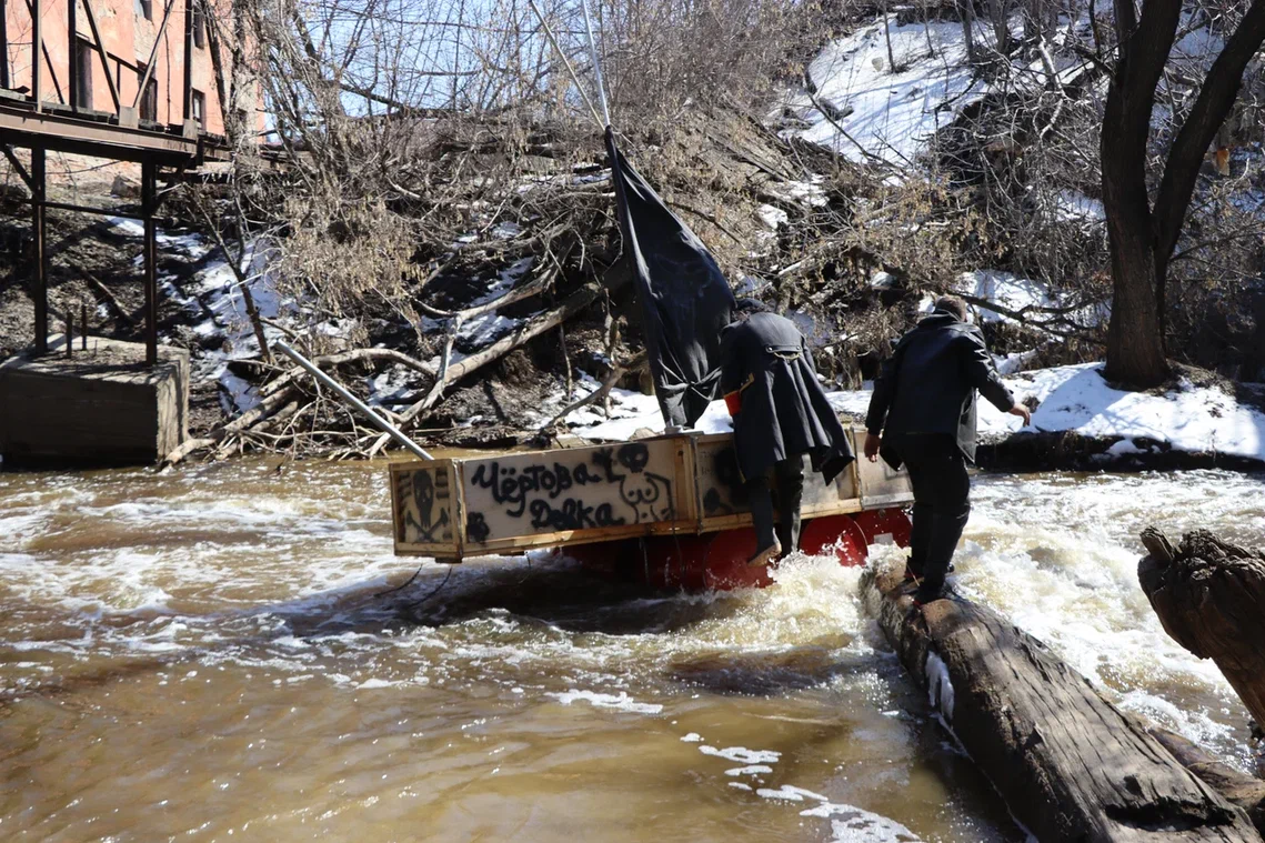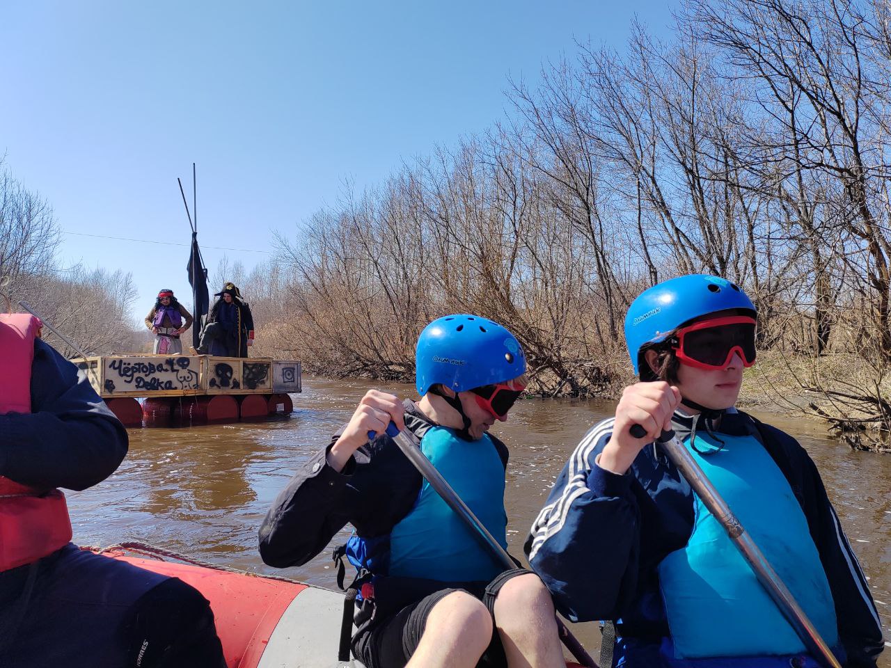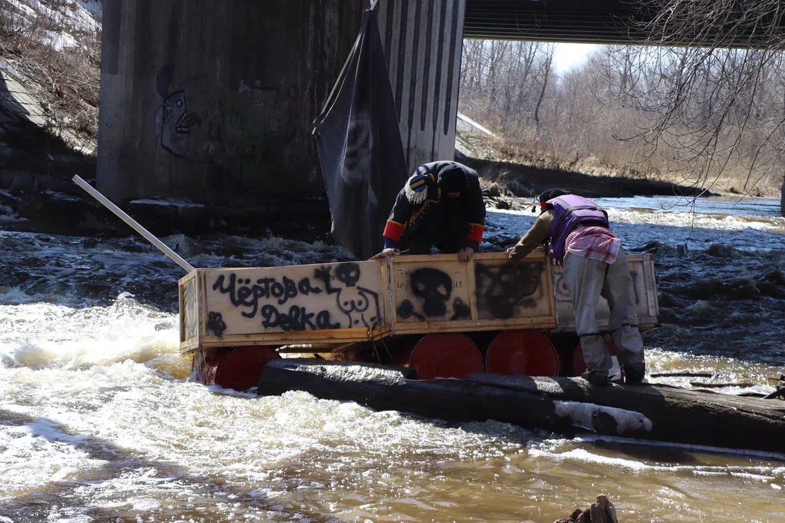 Прежде чем описывать дальнейшие события, придется сделать ещё один флэшбэк. В этом сезоне к классической команде «Дубовой рощи» присоединились ребята из ТК «Европа», которые совершенно случайно прослышали об этой замечательной традиции. К сплаву команда из двух человек подошла креативно: их судно представляло собой деревянную конструкцию на импровизированном понтоне из металлических бочек. Пиратские аллюзии подкрепляли чёрный флаг с Веселым Роджером и костюмы в стиле капитана Джека Воробья. Ну и весьма экстравагантная «гальюнная фигура», намалеванная на борту.