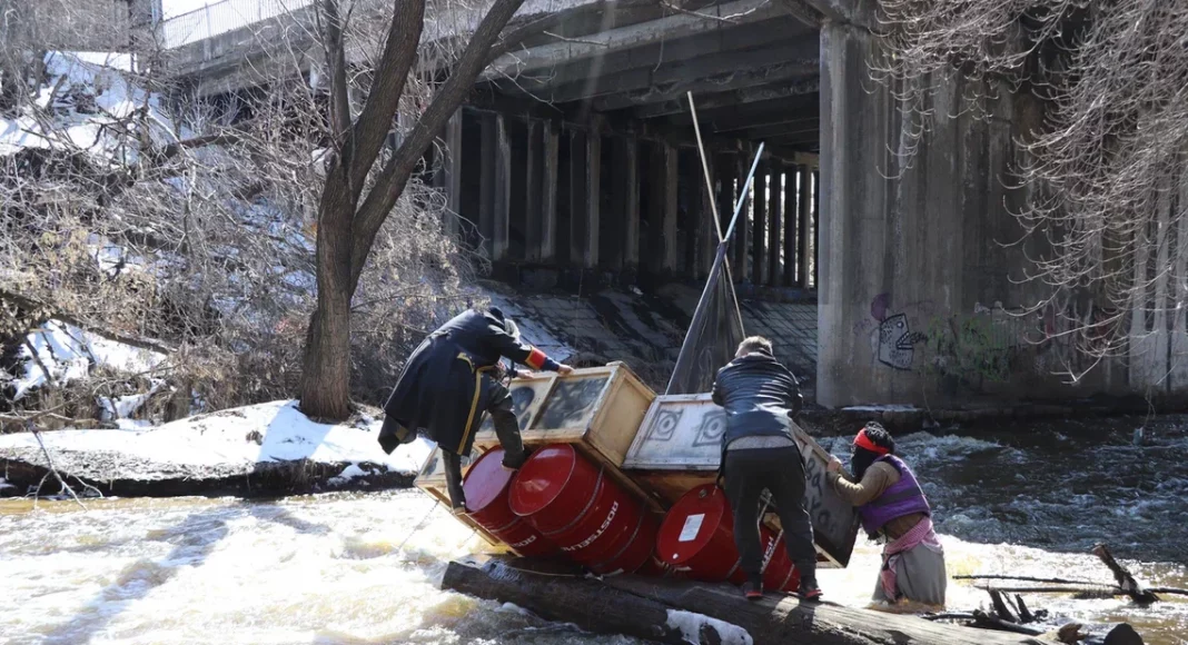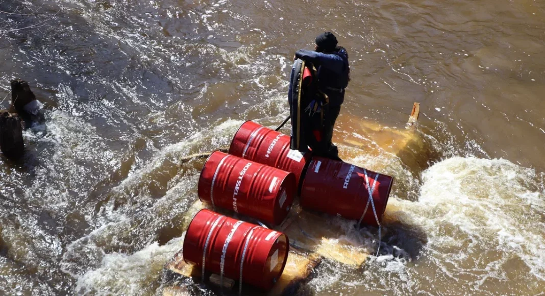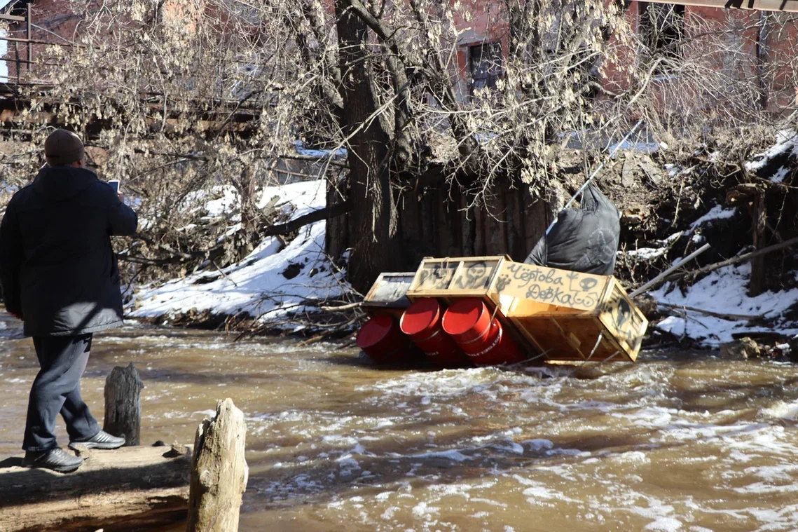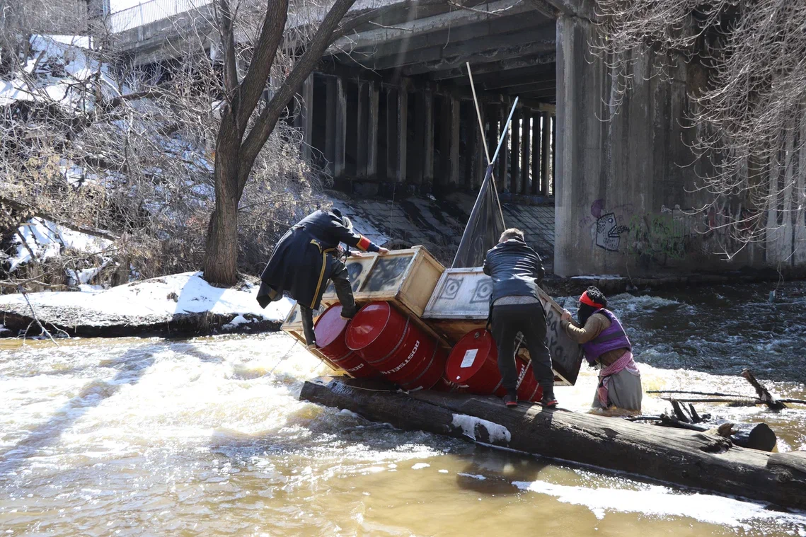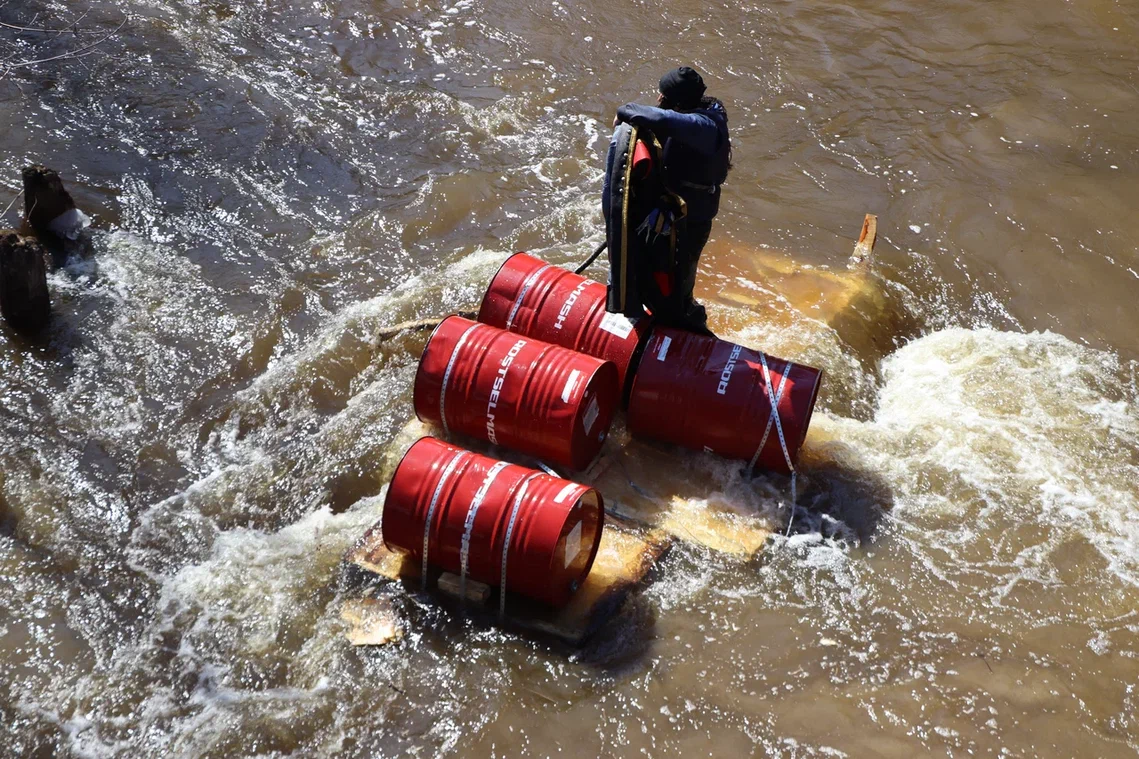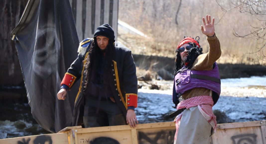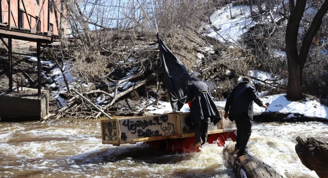 Прежде чем описывать дальнейшие события, придется сделать ещё один флэшбэк. В этом сезоне к классической команде «Дубовой рощи» присоединились ребята из ТК «Европа», которые совершенно случайно прослышали об этой замечательной традиции. К сплаву команда из двух человек подошла креативно: их судно представляло собой деревянную конструкцию на импровизированном понтоне из металлических бочек. Пиратские аллюзии подкрепляли чёрный флаг с Веселым Роджером и костюмы в стиле капитана Джека Воробья. Ну и весьма экстравагантная «гальюнная фигура», намалеванная на борту.