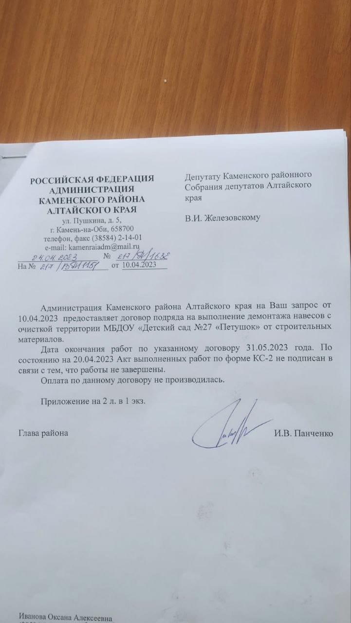 В ответе на запрос депутата глава района Иван Панченко поясняет: «Дата окончания работ по указанному договору 31.05.2023 года. По состоянию на 20.04.2023 Акт выполненных работ по форме КС-2 не подписан в связи с тем, что работы не завершены».