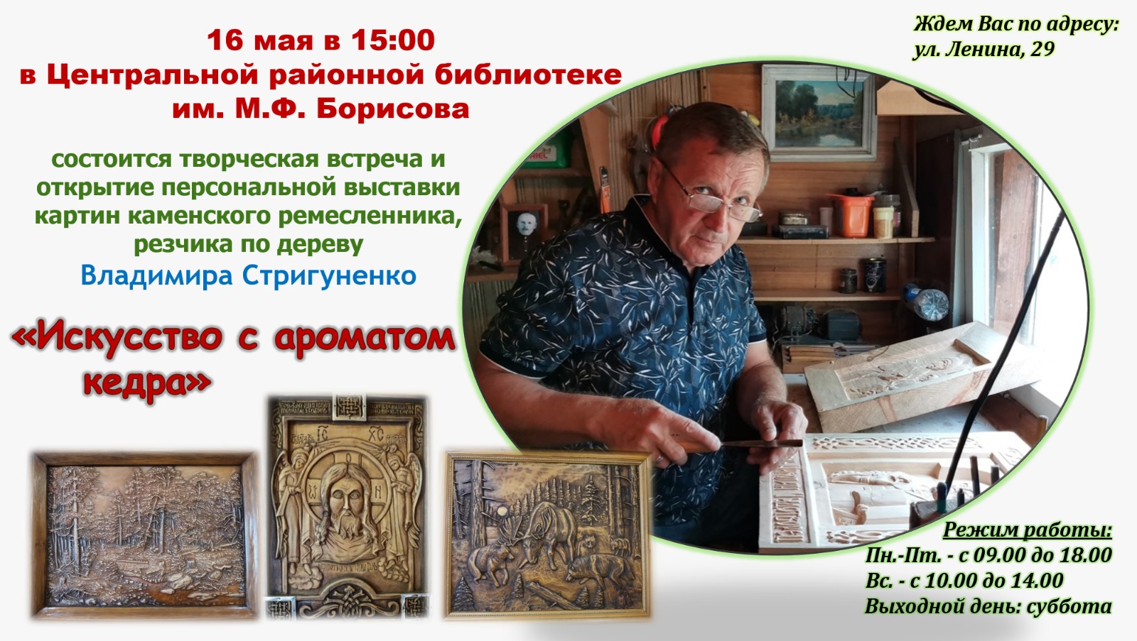 Так, 16 мая в 15:00 «Борисовка» приглашает жителей и гостей города на творческую встречу с Владимиром Стригуненко, каменским ремесленником, резчиком по дереву. Он не только даст возможность насладиться выставкой «Искусство с ароматом кедра», но и расскажет о своем увлечении, ответит на все интересующие вопросы о его работах, выполненных на цельных кедровых полотнах. Посетители экспозиции смогут увидеть такие картины как: «Три богатыря», «Утро в сосновом лесу», «Горный Алтай», «Мачтовый лес» и другие. Персональная выставка картин Владимира Стригуненко продлится до 30 мая включительно.