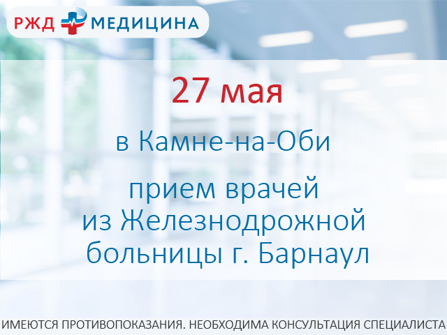 27 мая на площадке амбулатории ст. Камень по адресу г. Камень-на-Оби, ул. Мира, д. 2 состоится консультативный приём врачей Железнодорожной больницы г. Барнаула по следующим направлениям: