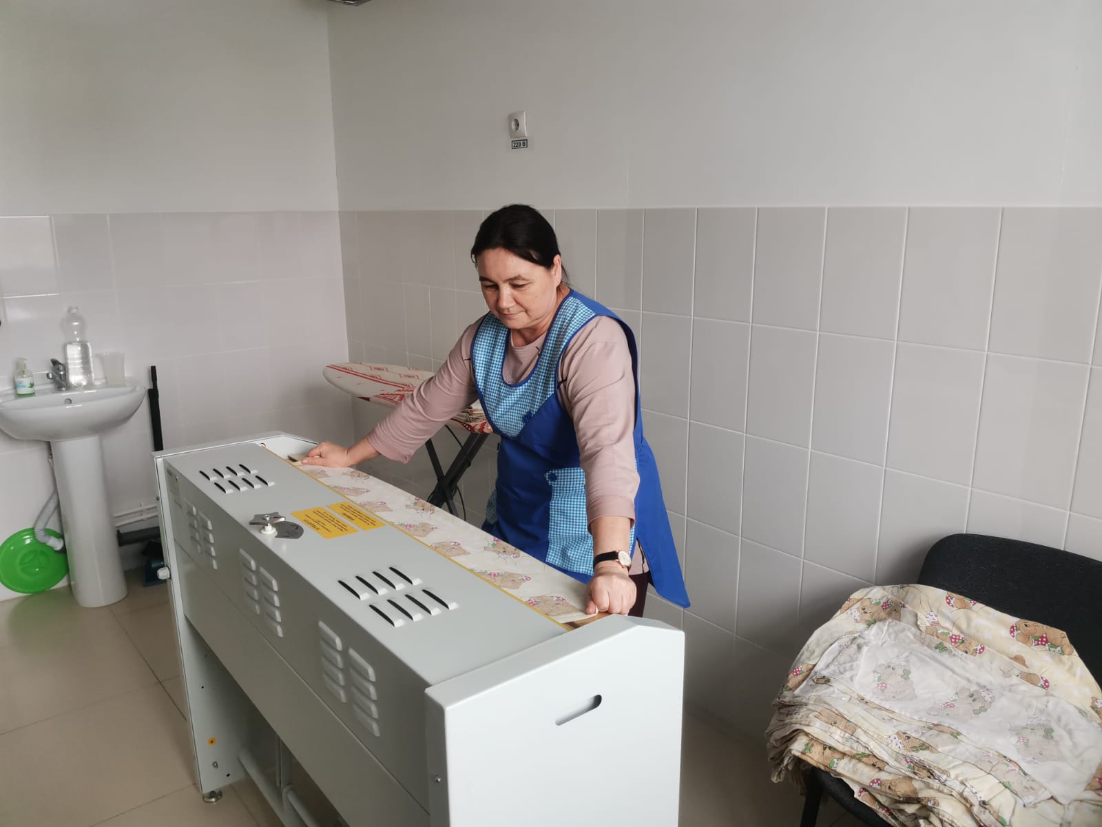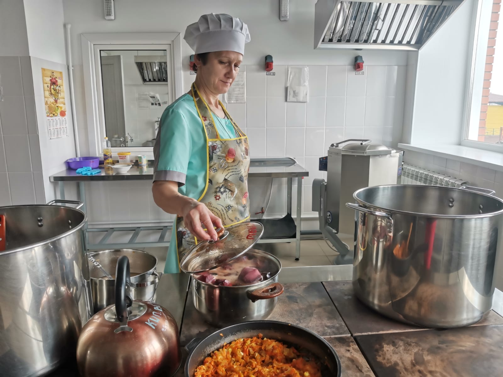 Во время экскурсии в детском саду царила тишина. Почти все ребятишки уже спали и только на кухне рабочие сновали туда-сюда. Аромат чего-то вкусного так и манил нас к кухонным помещениям, расположенным на первом этаже. Повар торопился приготовить полдник и делал заготовки из овощей на ужин.