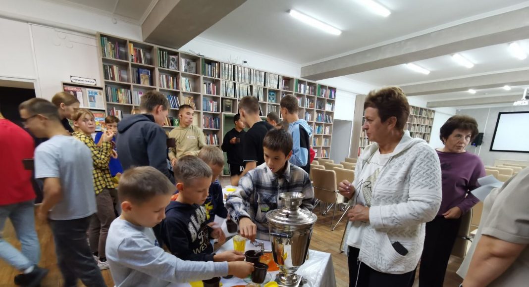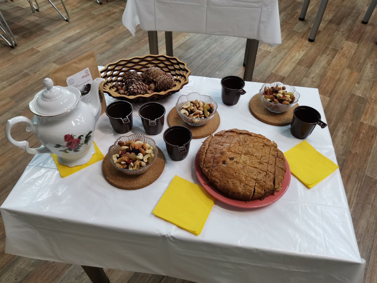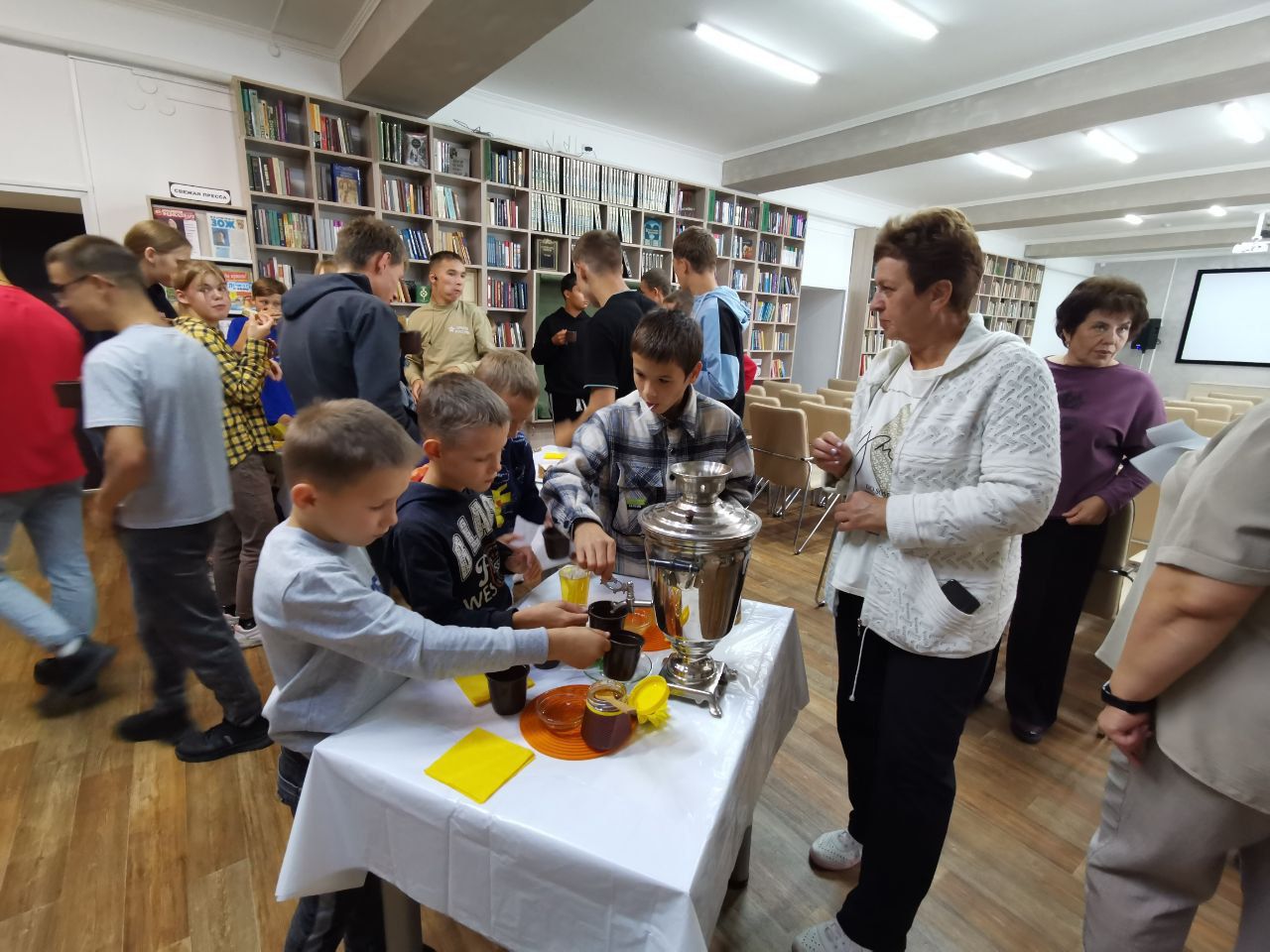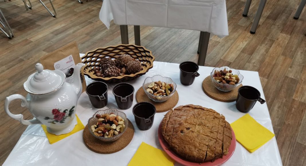 При входе в событийный зал юных гостей ждали три тематических стола. Один — медовый, где расположился мед двух видов, самовар, чай. На втором ждали угощения с яблоками — блины с яблочной начинкой и яблочки. Третий — Ореховый встречал ребят ореховым кексом и ореховой смесью.