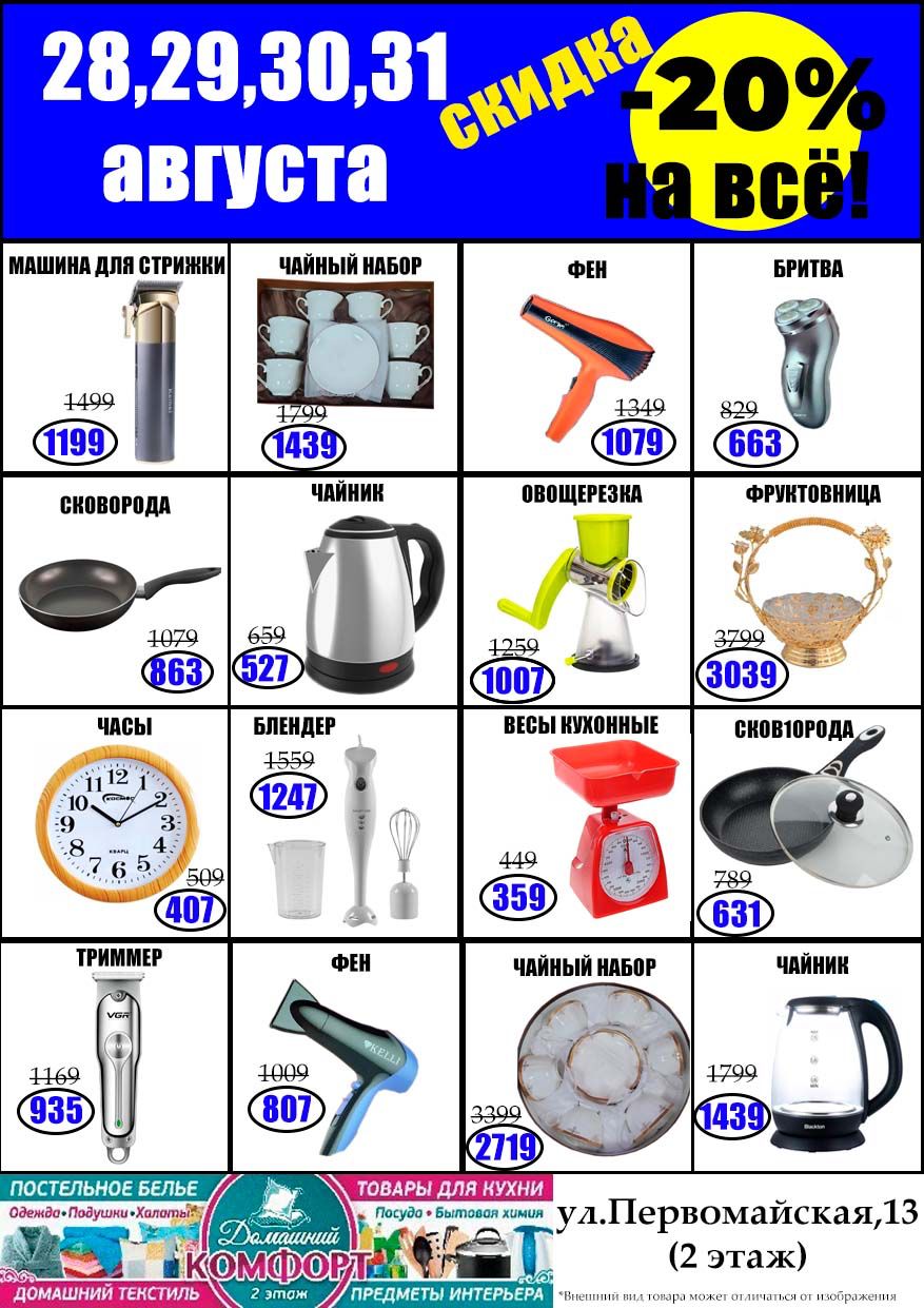Скидка -20% на весь ассортимент товара . Только 4 дня 28,29,30,31 августа .