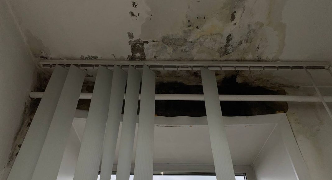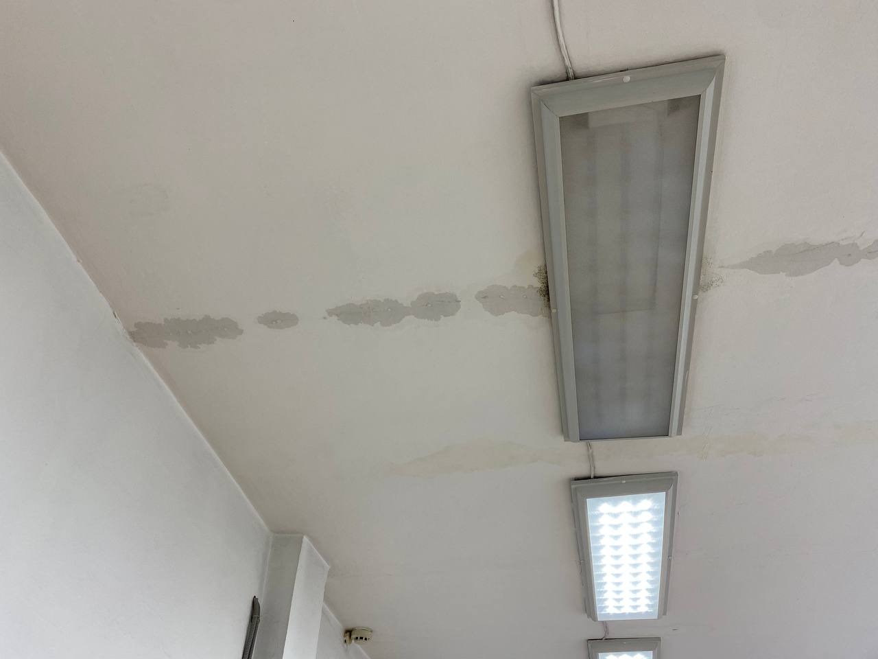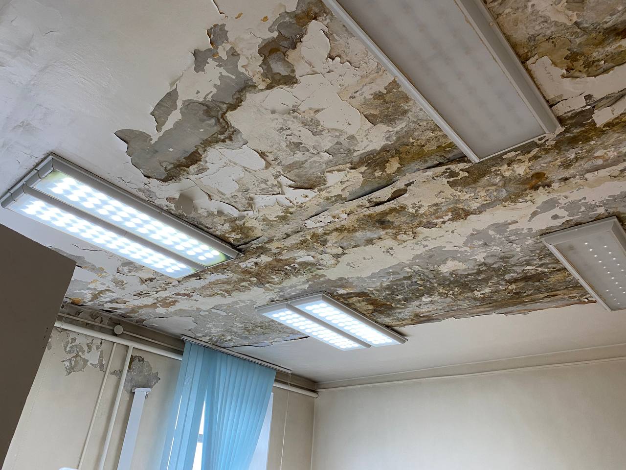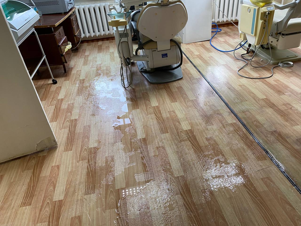 Сегодня в городе дождь и врач была вынуждена перенести прием двух пациентов, так как с потолка бежит прямо на стоматологическое оборудование.