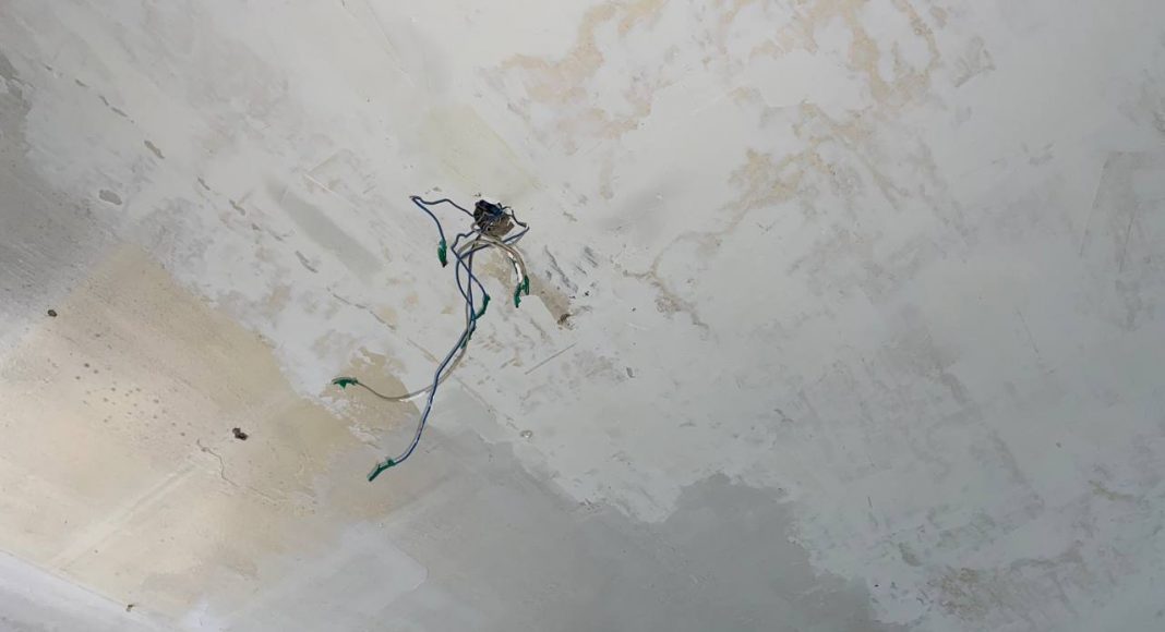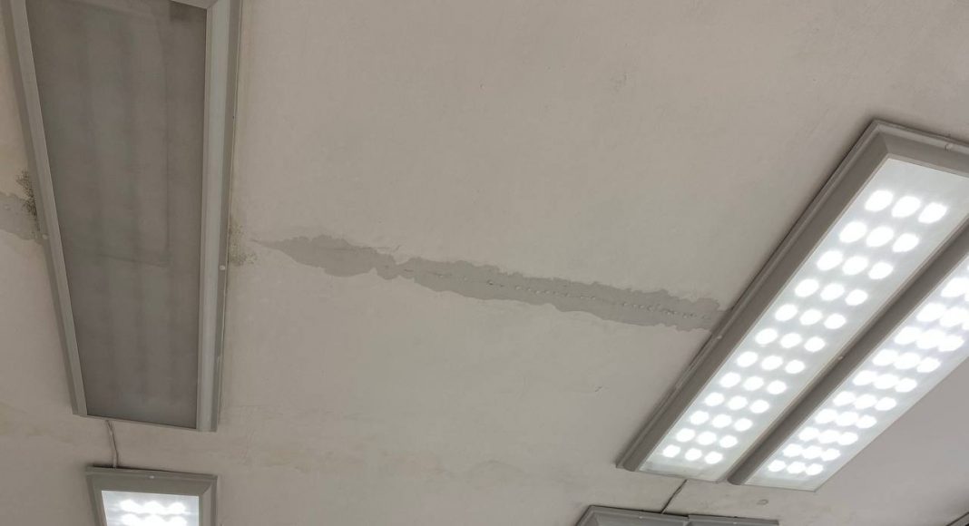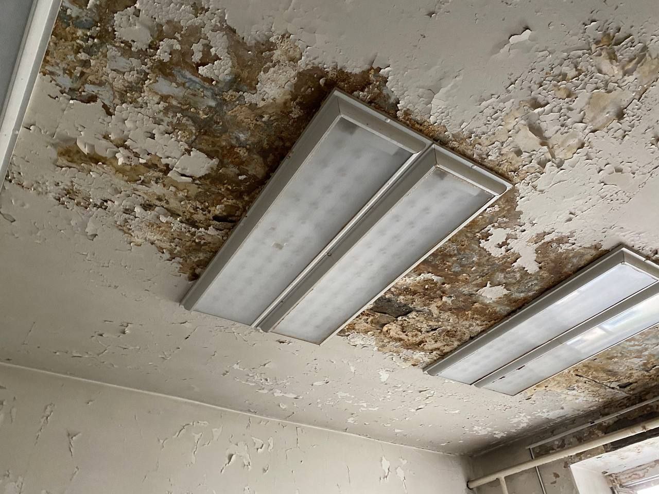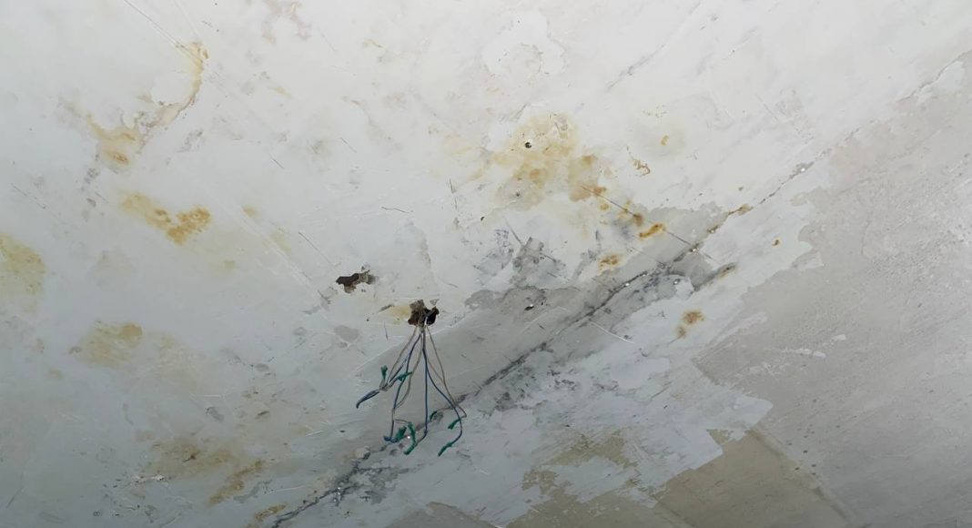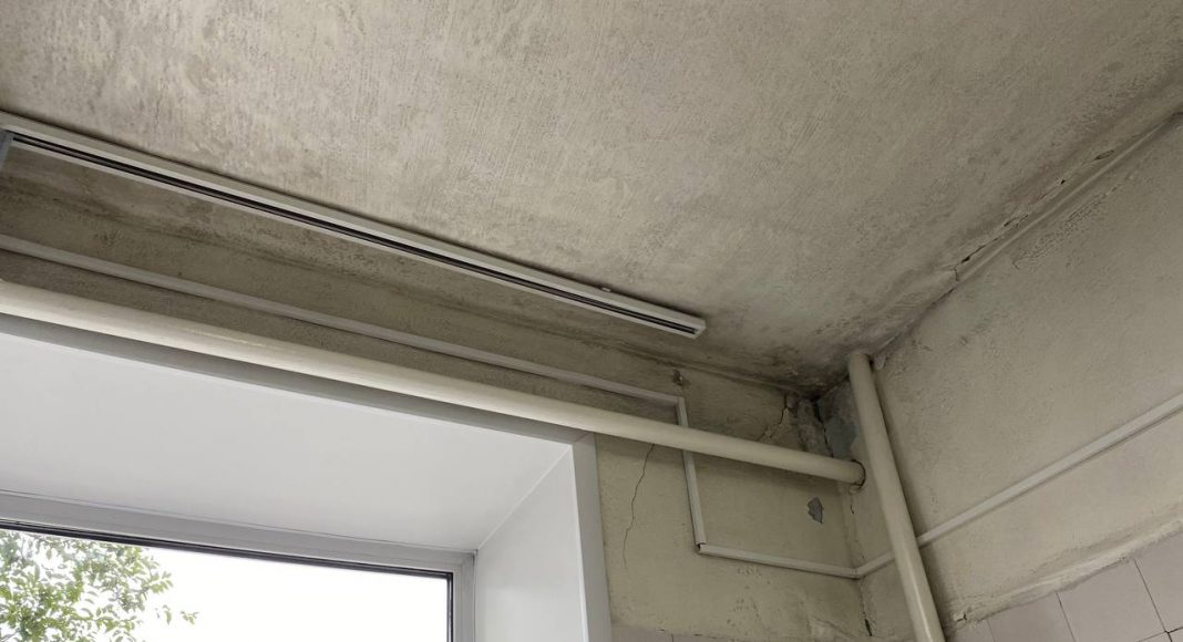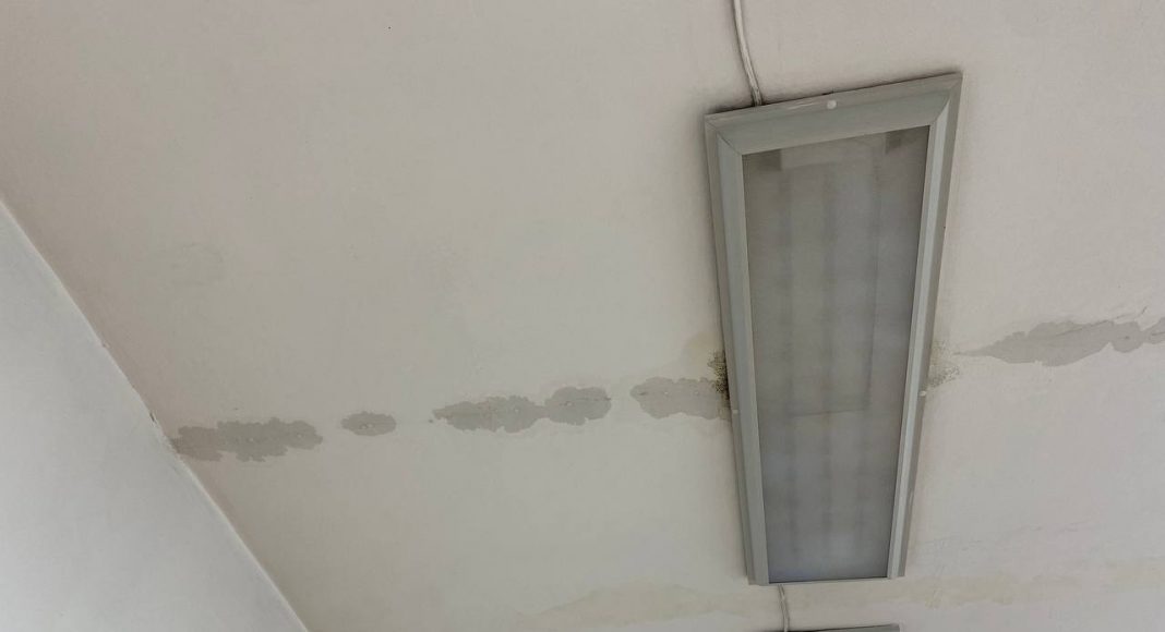 Сегодня в городе дождь и врач была вынуждена перенести прием двух пациентов, так как с потолка бежит прямо на стоматологическое оборудование.