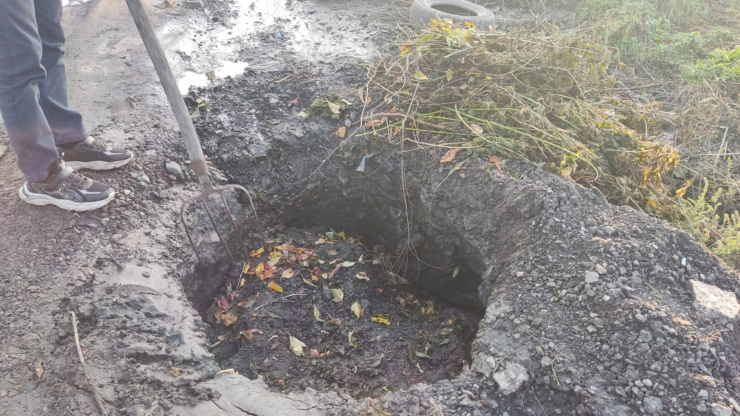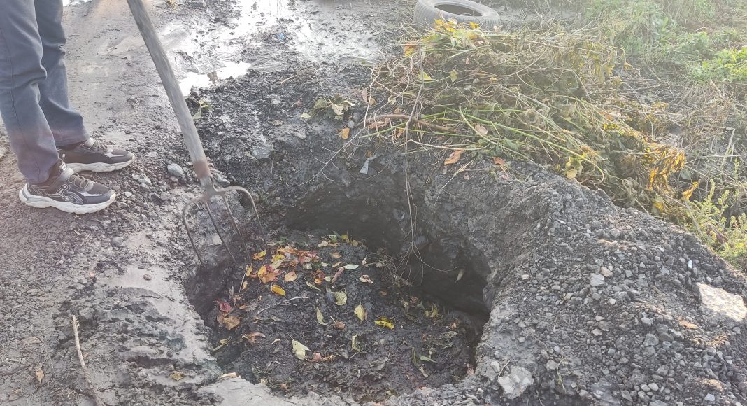 Мы уже писали о том, что на улице Революции 15 сентября образовался опасный провал в грунтовой дороге. Яма была настолько глубокая и большая, что легко могла поместить в себя человека невысокого роста. За выходные местные жители попытались хоть немного обезопасить автомобилистов и пешеходов, воткнув в яму большую ветку и уложив вокруг автомобильные покрышки. Еще через несколько дней на опасную ситуацию отреагировали власти, засыпав шлаком провал.