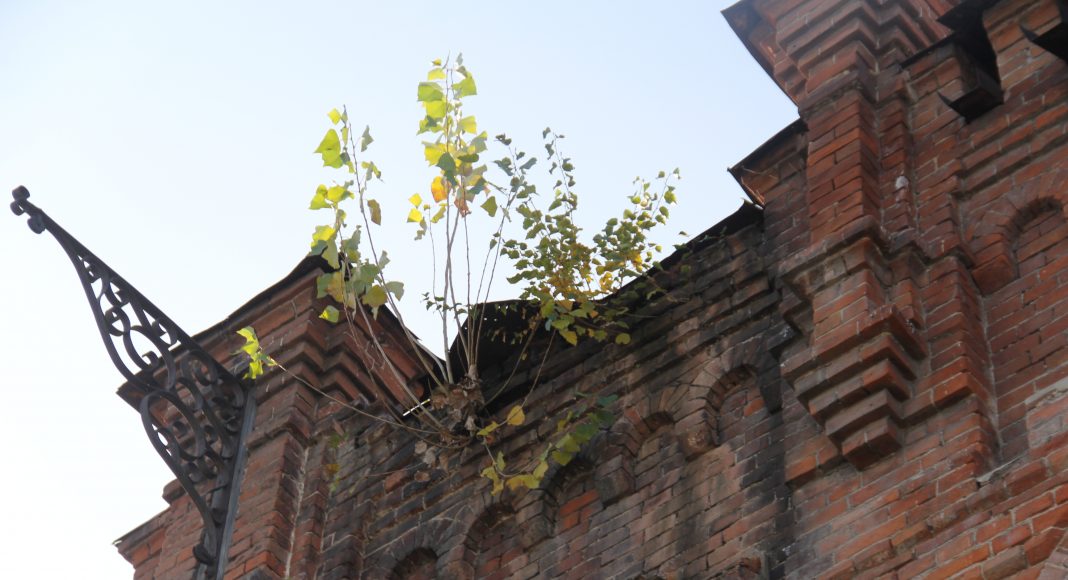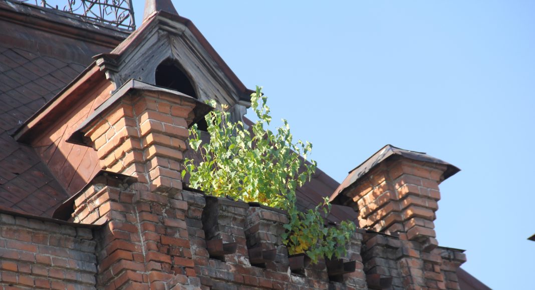 Как говорится, не прошло и двух лет, как кровля уникального исторического здания вновь «заколосилась» висячими садами Семирамиды… На и без того нуждающемся в капитальном ремонте памятнике архитектуры краевого значения снова проросли деревья. Причем, в тех же местах, где были выпилены два года назад.