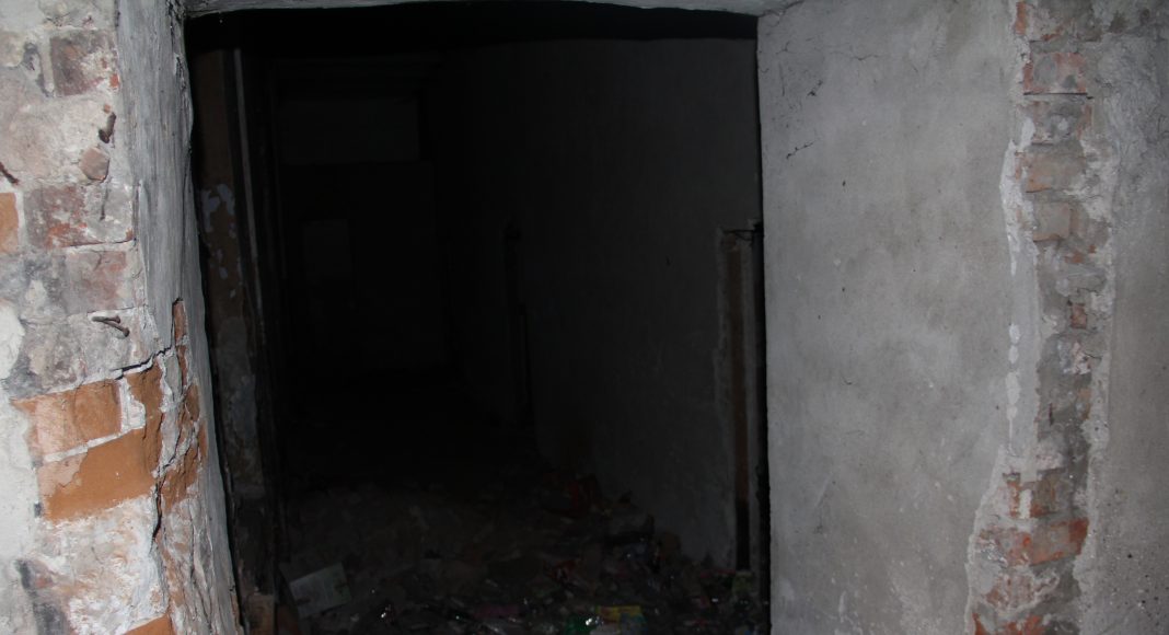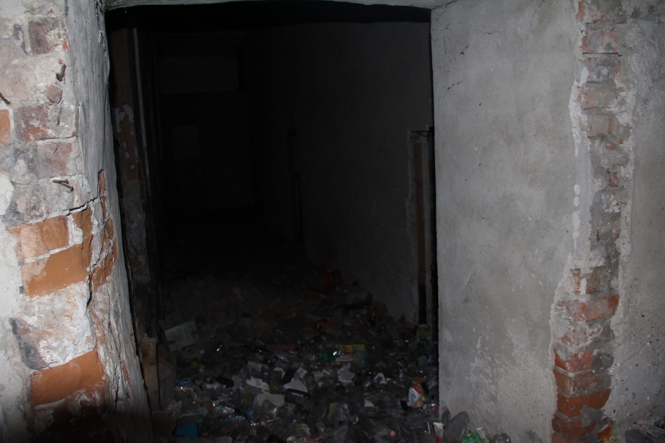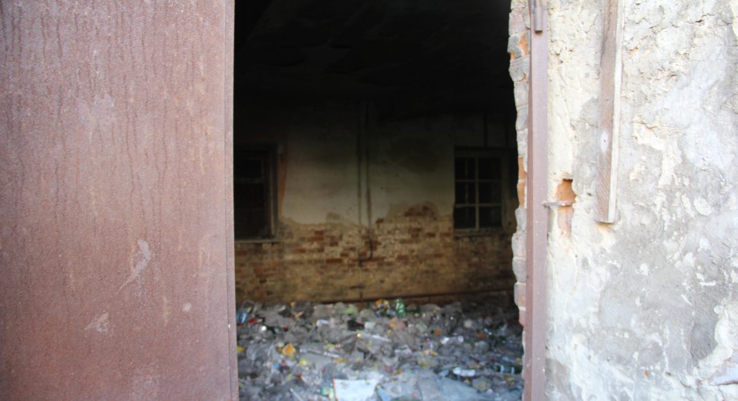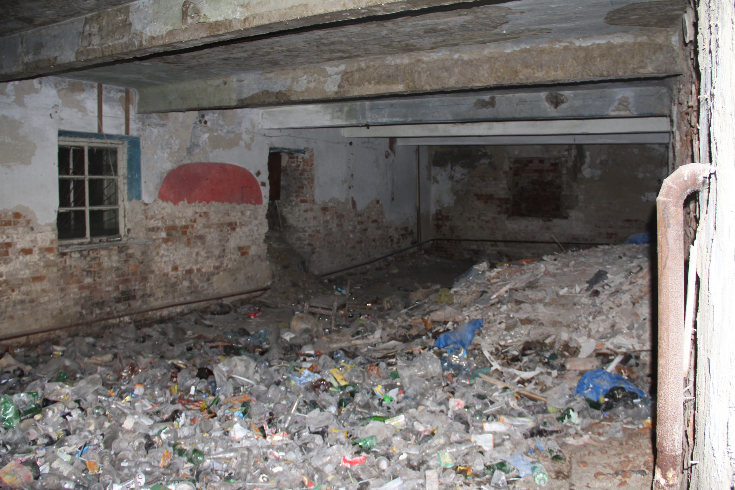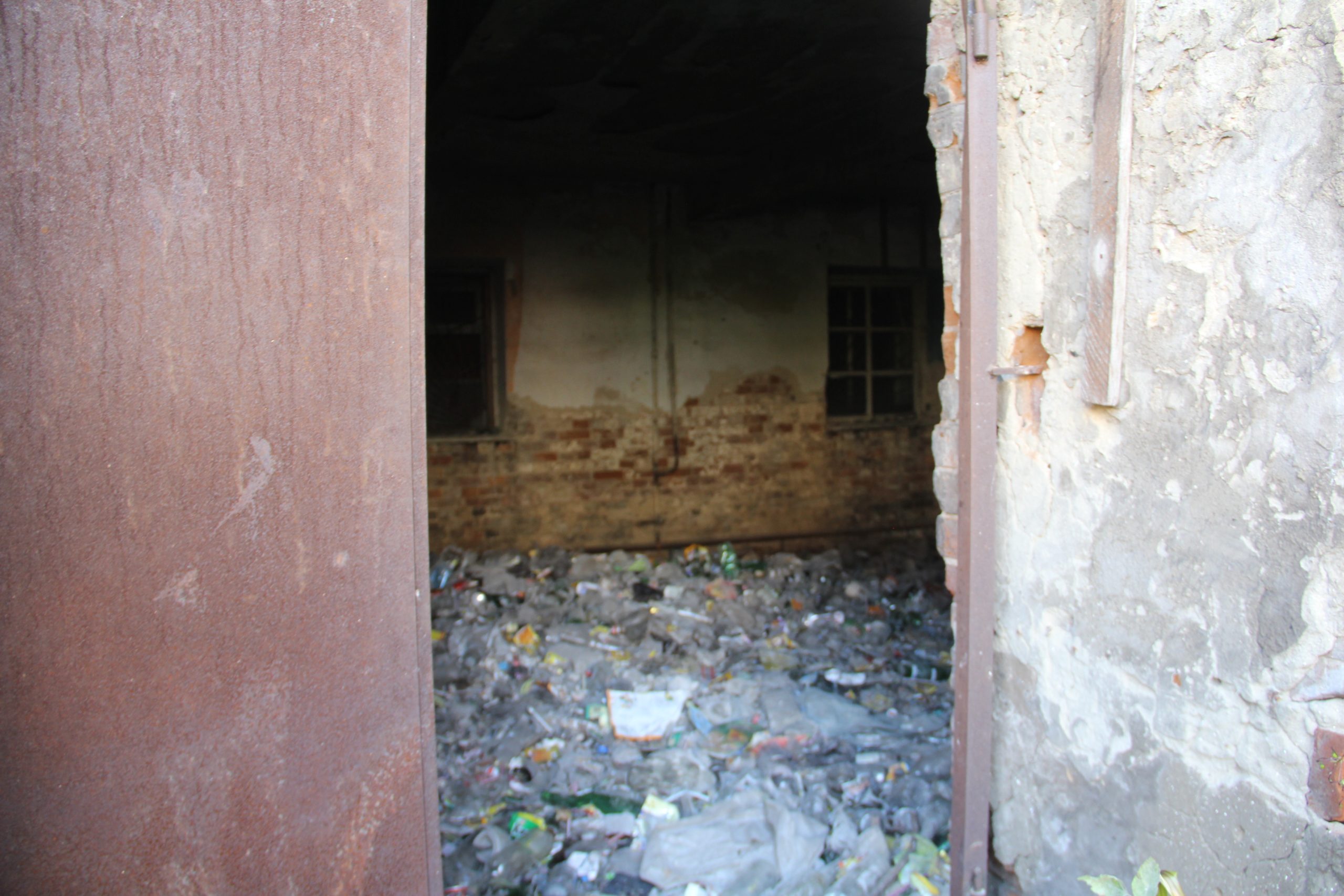 Не дождались однако. Наверное, и разрушенное крыло здания уже не спасти, провалы крыши в нем фатальные. А рядом с разрушающимся крылом двери первого этажа настежь. И если вы решите насладиться прогулкой по старинным комнатам открытого для доступа помещения, будьте уверены, историей здесь не пахнет. Здесь вы встретите огромную несанкционированную свалку с кучей бутылок, стульев, старой обуви и всякой всячины. Горы, тонны. Резонные вопросы возникают — чье добро? И кто так бесконтрольно и безнаказанно здесь его копит?