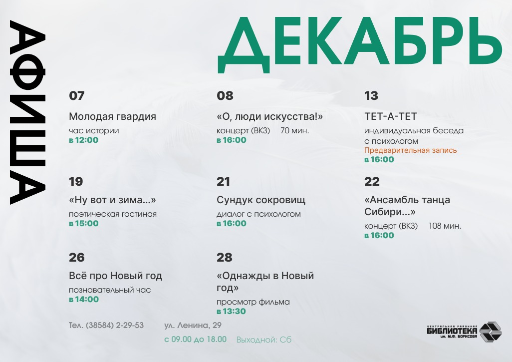 В первый месяц зимы в Центральной районной библиотеке пройдут концерты, познавательные часы, беседы с психологом, а также можно посетить поэтическую гостиную.