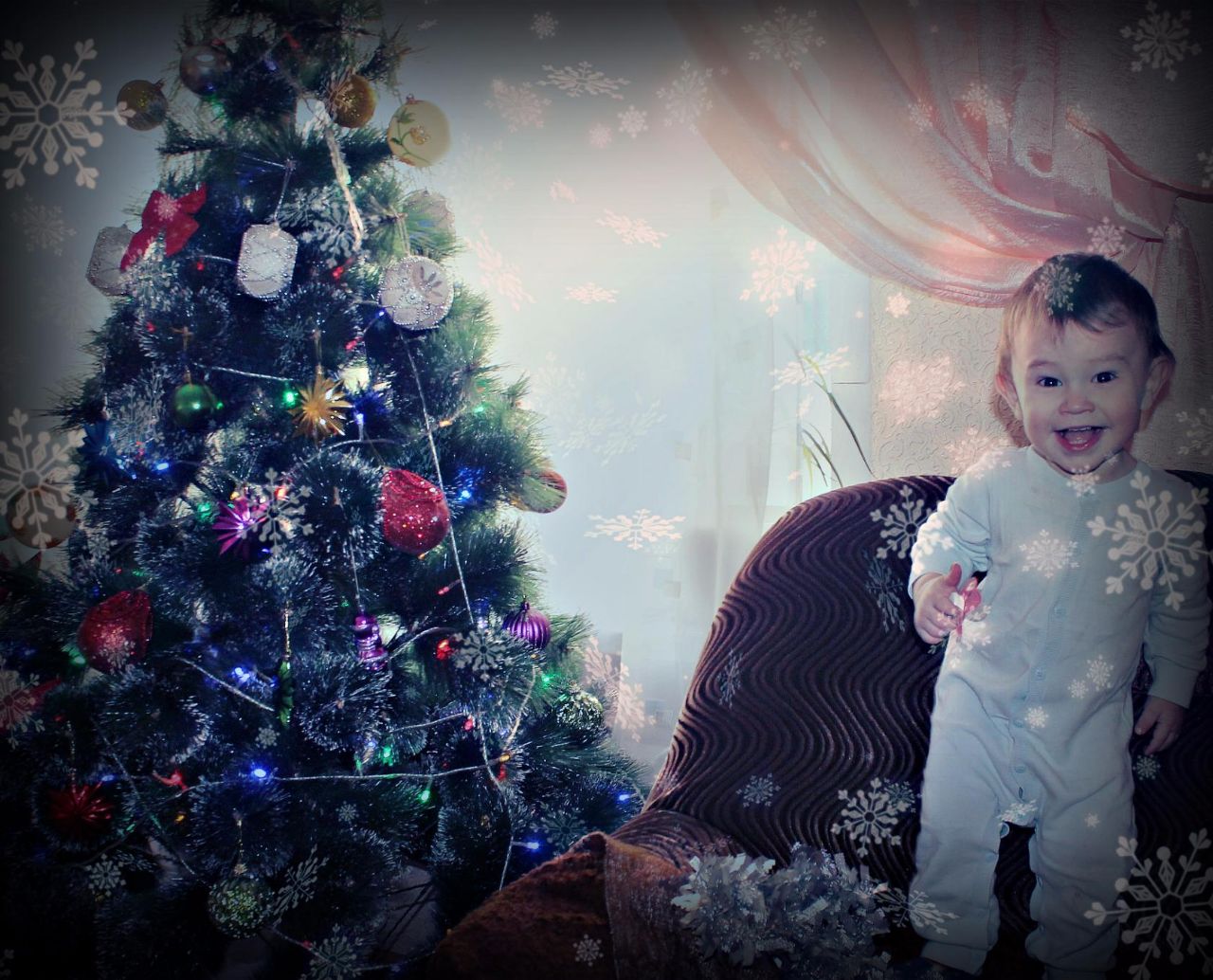 Всем привет меня зовут Никита. На этих фото два моих первых Новых года. На первом фото я только увидел елочку, ее красивые разноцветные огоньки и множество игрушек. А на втором фото я уже был постарше на год и помогал маме с папой наряжать лесную красавицу, подавал им шарики и ждал подарочек от деда Мороза.
