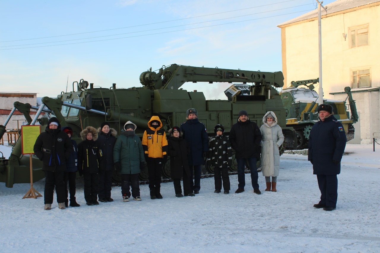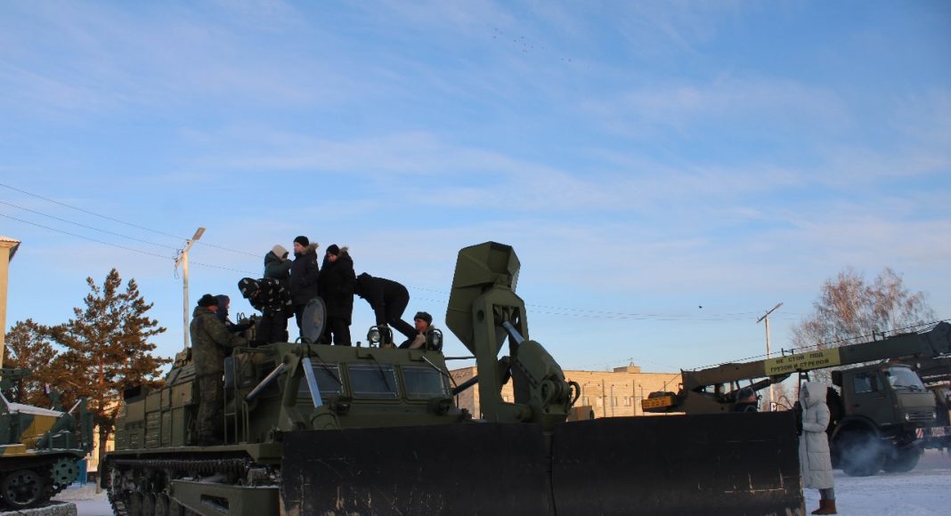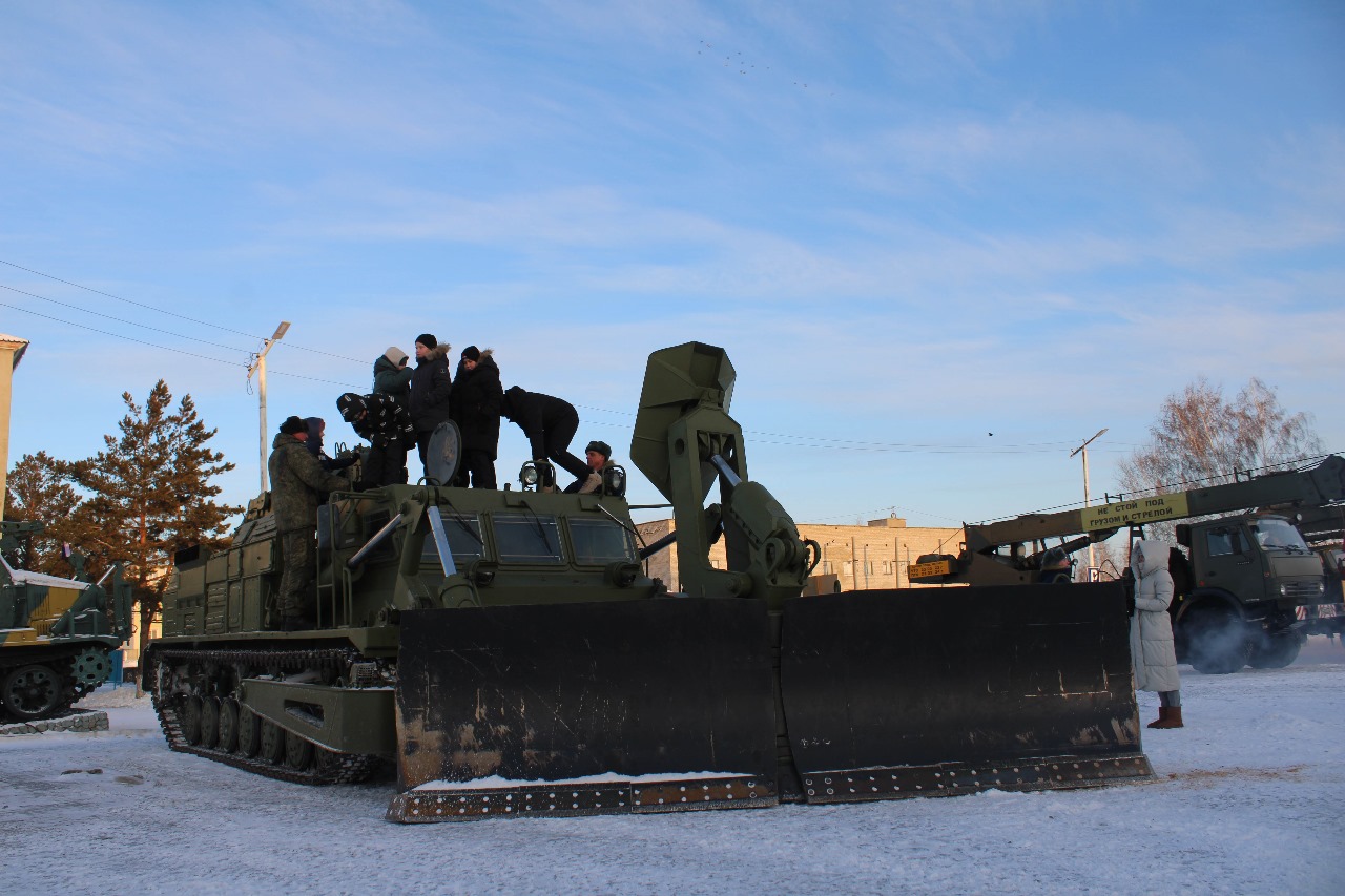 День выдался морозный, но это не помешало начать его с праздничного построения с поздравлениями от командования части. А в 10 часов утра батальон уже открывал свои двери для школьников. Ребят из Лицея № 4 военные доставили своим транспортом, для них на территории части была проведена выставка рабочей техники, она вызвала у них неподдельный интерес.