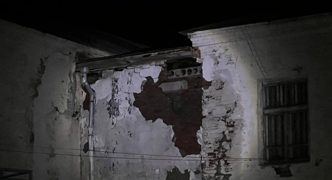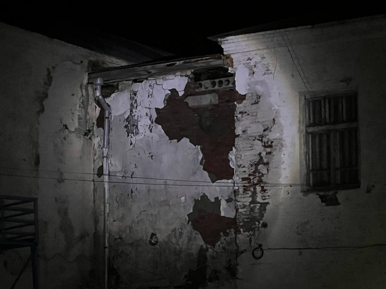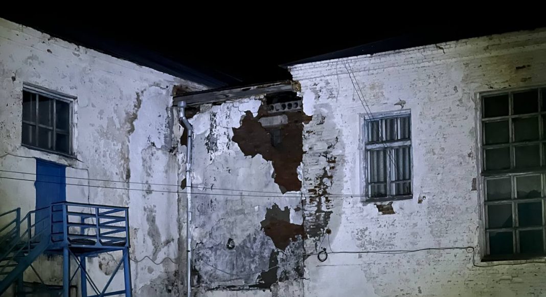 Частичное обрушение стены произошло в школе № 3. Место происшествия уже оцеплено заградительной лентой. Местами выпала кирпичная кладка и обвалилась штукатурка, вокруг видны мокрые подтеки.