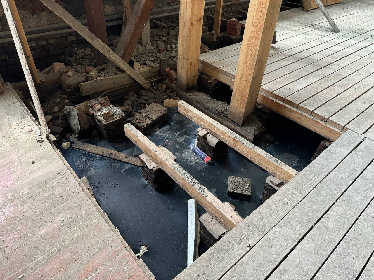 «После того, как были выполнены все работы по контракту, мы зашли в нижний борцовский зал, — говорит Иван Панченко, — я заметил, что на одной из стен по бокам и по низу идут черные разводы. Попросил вскрыть эти стены, чтобы посмотреть, что происходит под старой обшивкой из вагонки. Когда начали вскрывать, выяснилось, что от того, что под полом ежегодно поднимается уровень воды, постоянная сырость оказала пагубное влияние на несущие конструкции. Кладка кирпича под одной из балок рассыпалась. Несущая балка выглядела удручающе. Когда я к ней подошел и нажал на нее, кирпич начал крошиться. Можно представить, какая нагрузка на эту балку была и какие могли быть последствия.