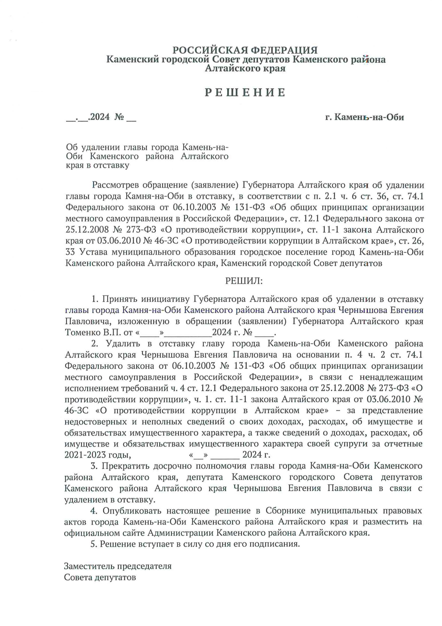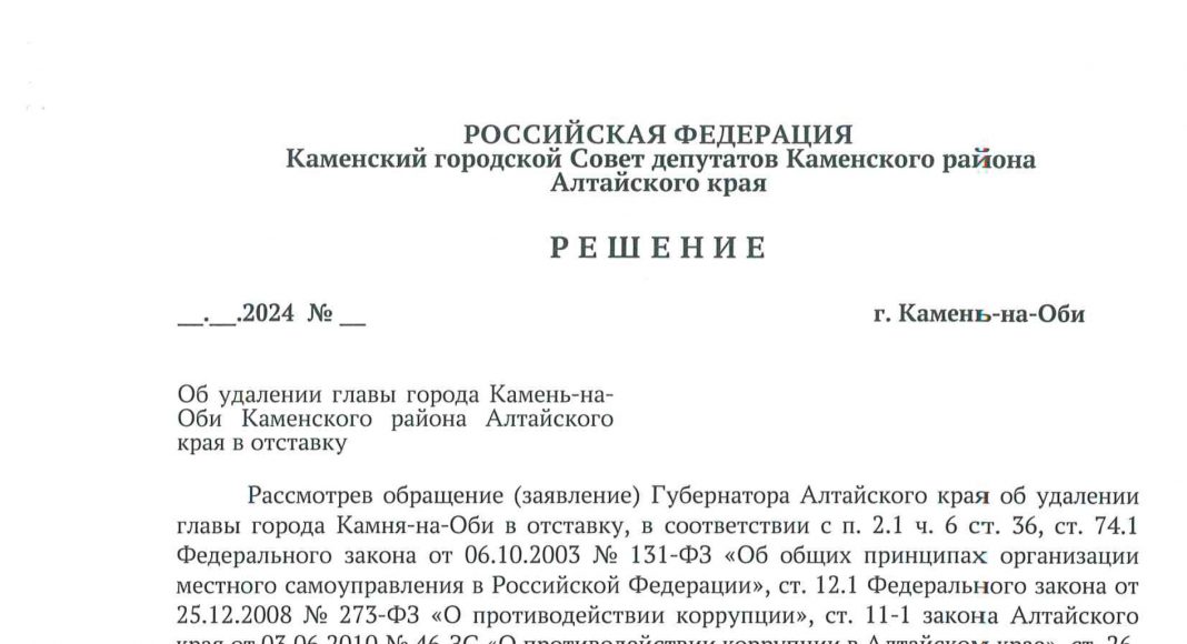 Глава региона направил в адрес горсовета не только обращение (заявление) об удалении главы города в отставку, но и готовый проект решения по этому поводу, который «думцам» останется лишь принять.