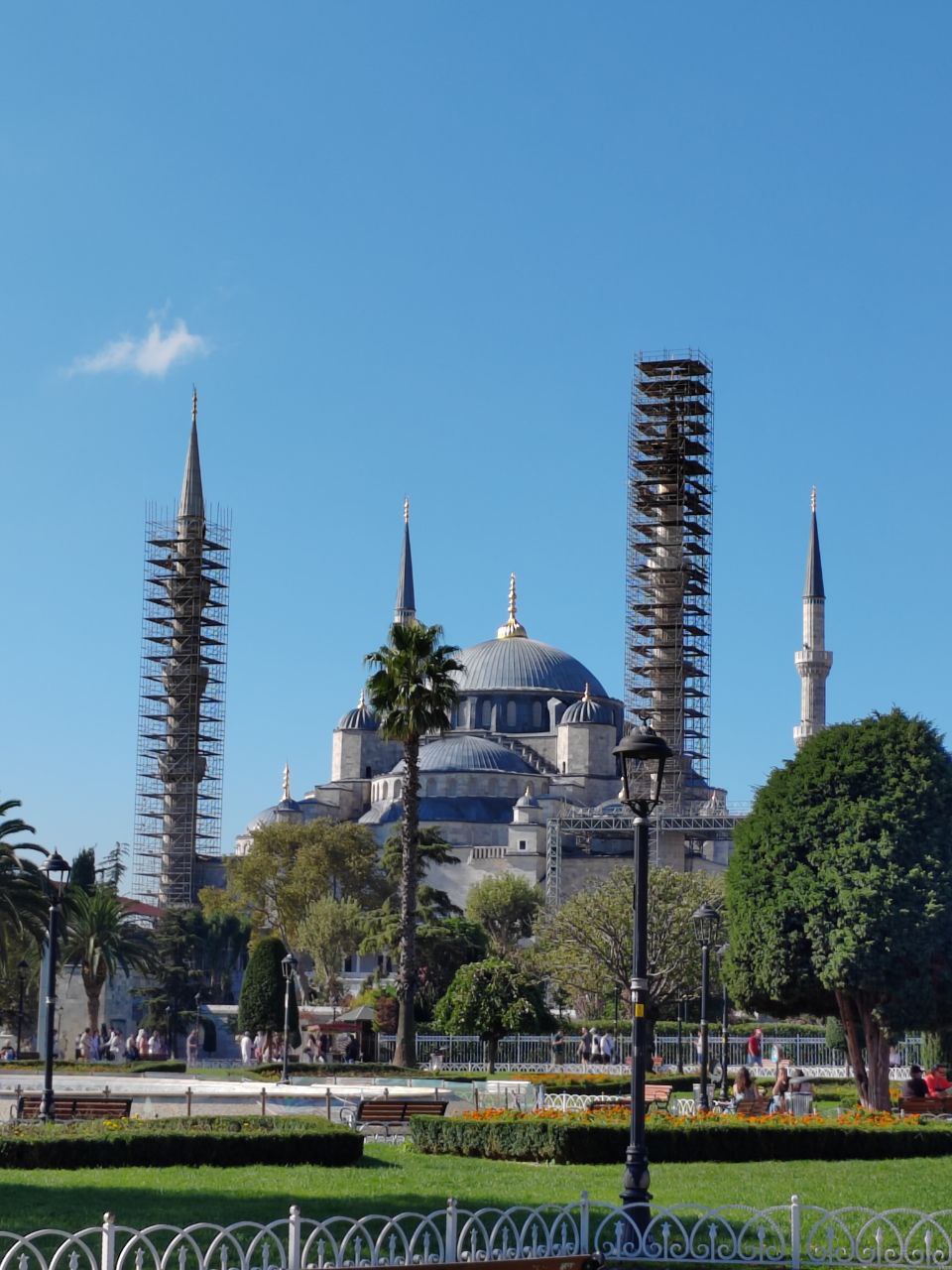 Напротив через площадь расположилась не менее знаменитая мечеть Султанахмет (или как её ещё величают — Голубая мечеть). Вход туда бесплатный и неограниченный. Разве что, внутри установлены деревянные ограждения, разделяющие прогулочную зону от мест для молящихся. На входе можно получить юбки-накидки и платки, вы их получите бесплатно, если вдруг додумались идти в мечеть с голыми ногами и непокрытой головой. Волосы нужно прятать только женщинам, а голые ноги — всем. Обязательно к посещению, если вы хотите увидеть квинтэссенцию османского зодчества и искусства.