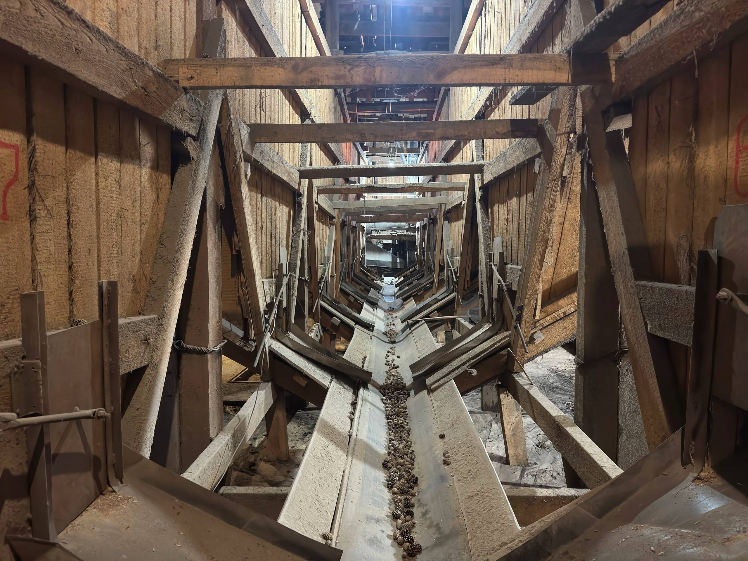 «Подробно процесс описывать не буду, чтобы не запутать читателей. Остановлюсь лишь на основных моментах. С холодного склада шишка попадает по транспортеру в бункер, в него входит 500 килограмм, — проводит нам небольшую экскурсию инженер, — затем шишка насыпается в решета, разравнивается ровным слоем. В течение четырех часов происходит рассушка при температуре не больше 37−40 градусов. Таким образом, удаляется лишняя влага. Потом еще процесс избавления о крылатки.