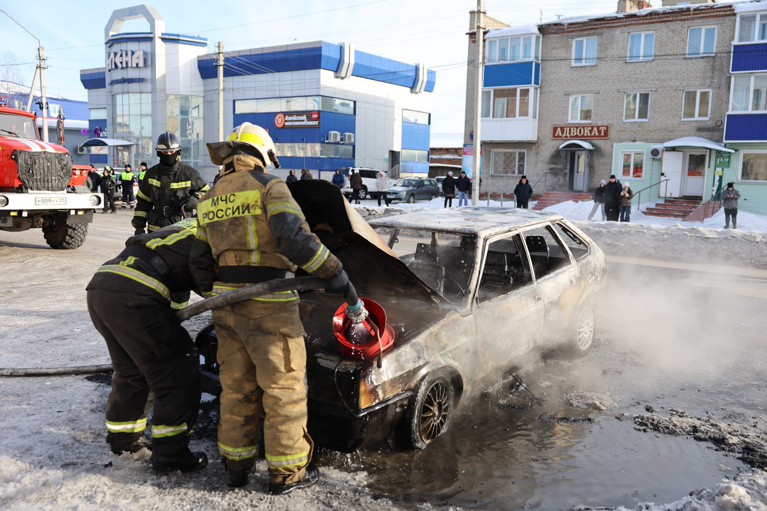 «Все произошло быстро. Буквально за 30 секунд панель автомобиля выгорела, — говорит хозяин сгоревшей «девятки» Максим, — машина задымилась на ходу, мы ее утолкали с дороги на обочину у центральной остановки и начали засыпать горение снегом, но это не помогло.