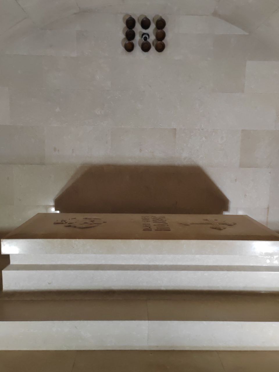 Ярусом ниже (судя по всему, он высечен в скале) находится саркофаг с останками последнего императора. Кстати, черногорцы не стали издеваться над телом своего лидера мумификацией, под тяжёлой каменной плитой обычные бренные останки великого человека.