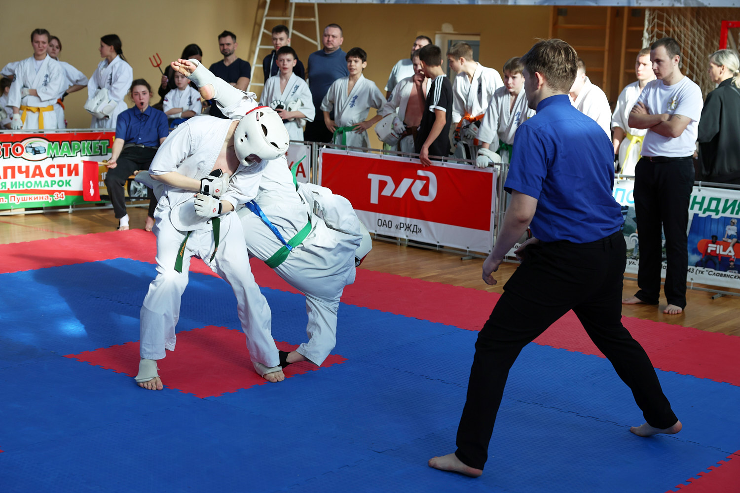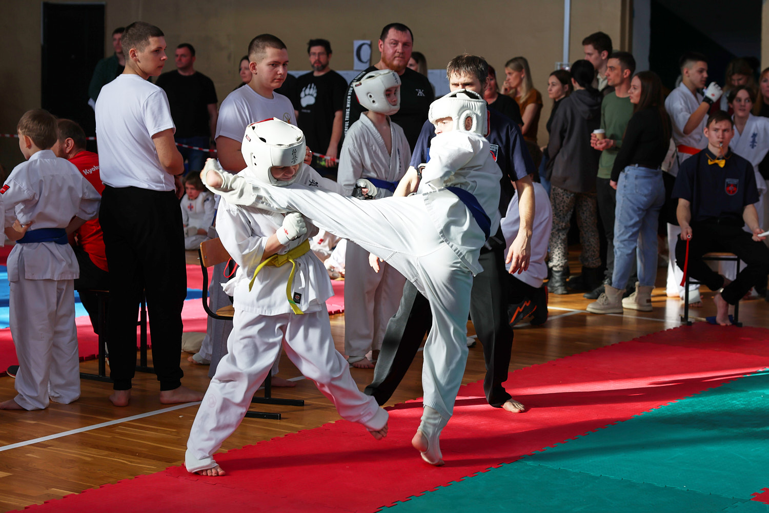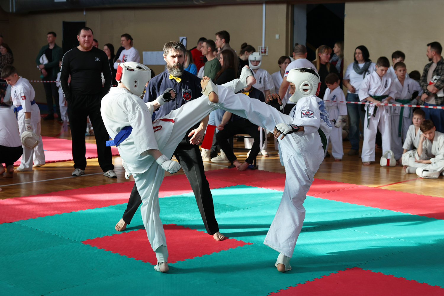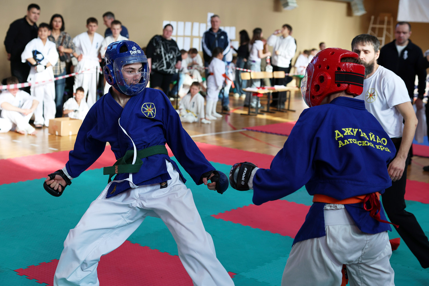 В этот день нешуточные баталии развернулись сразу на трёх татами. Бои в стиле джутайдо по версии «К» — это зрелищные поединки, по-киношному техничные. Но на самом деле это жёсткое полноконтактное единоборство, а не боевая голливудская хореография: эффектные (и эффективные) удары ногой, грады атак в корпус, сокрушительные удары кулаками в голову. Для джутайдо и амуниция серьезнее — щитки, шлемы с пластиковым визором, полностью защищающие голову.