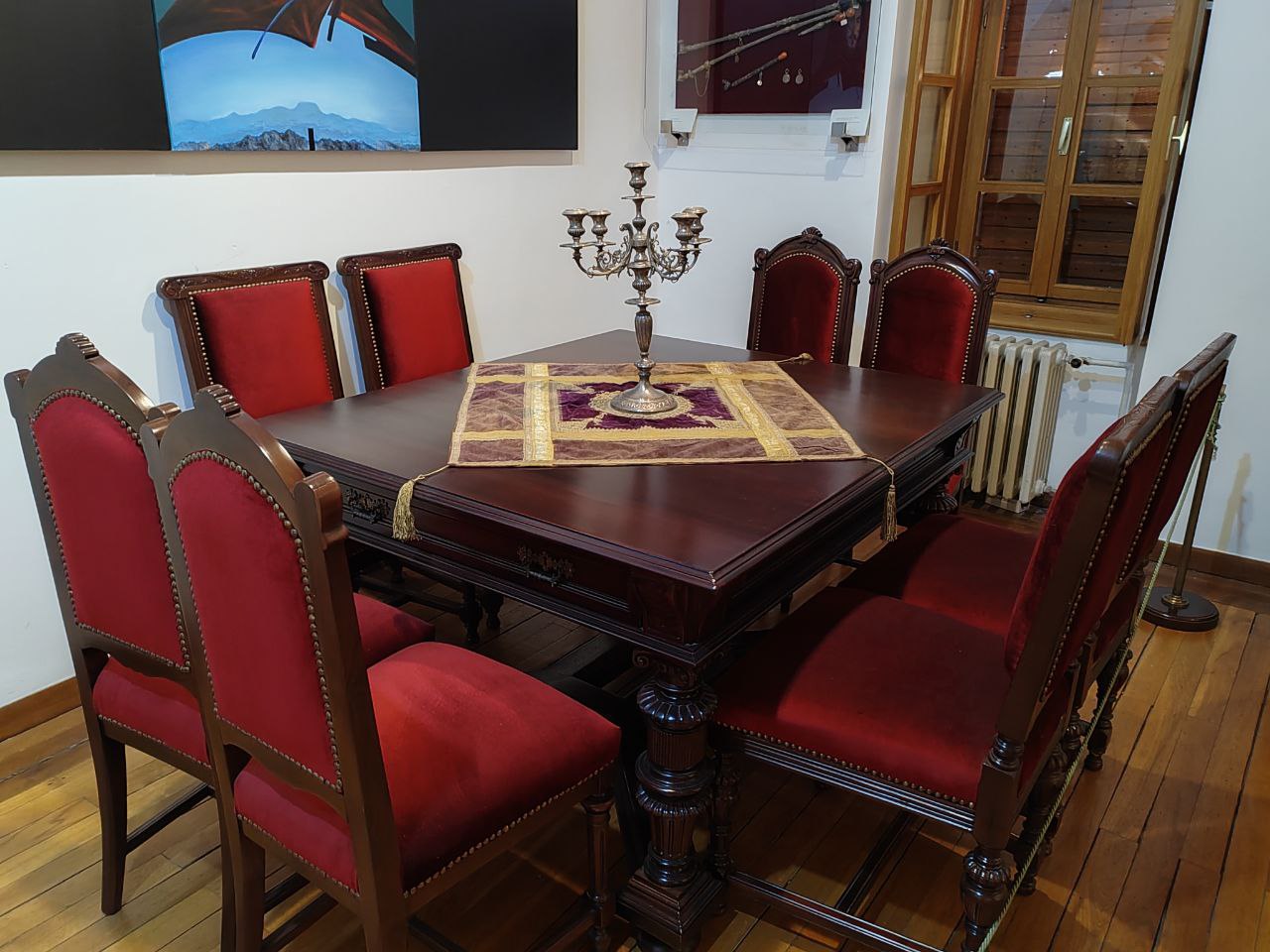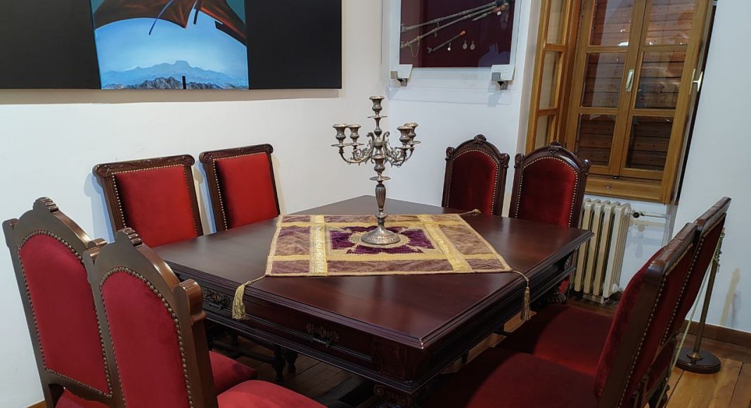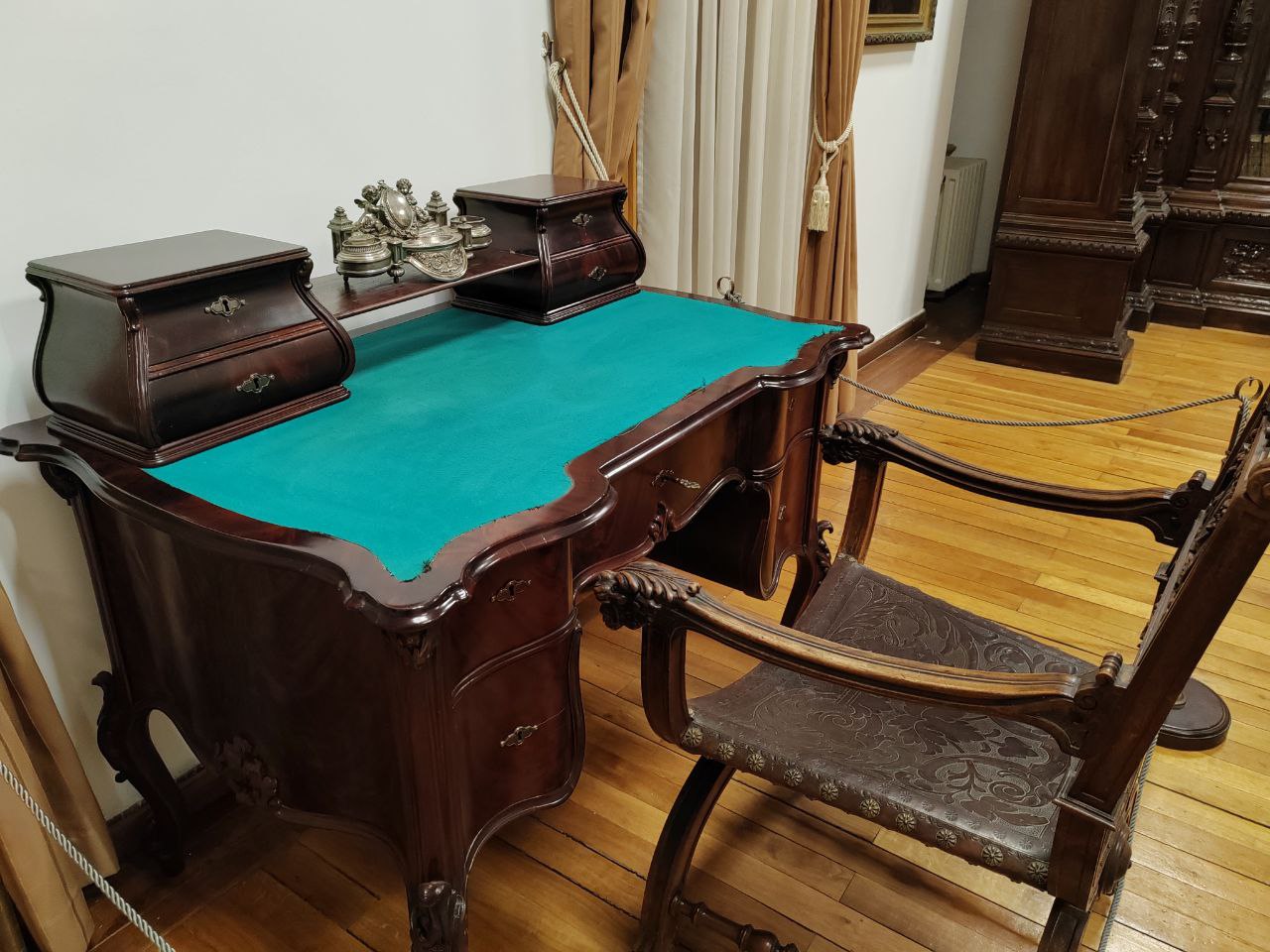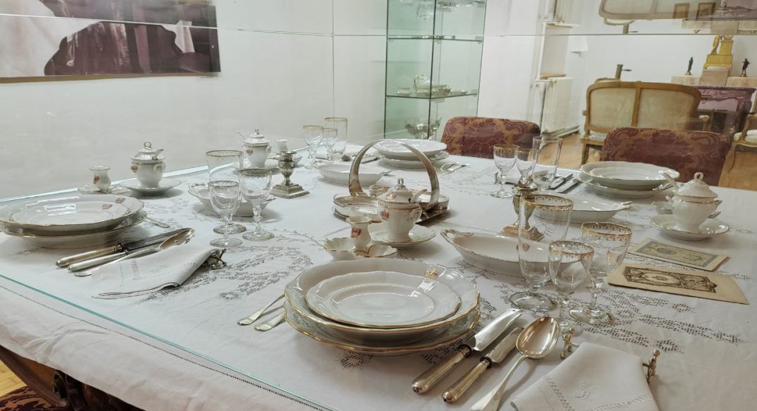 Время здесь застыло. Сервированный стол в столовой, потертые кожаные кресла, внушительные деревянные дорого-богатые секретеры, письменные столы, дамские платья, мужские фраки и военные мундиры, из которых вынули людей — такое ощущение, что отсюда просто все куда-то вышли и скоро вернутся.