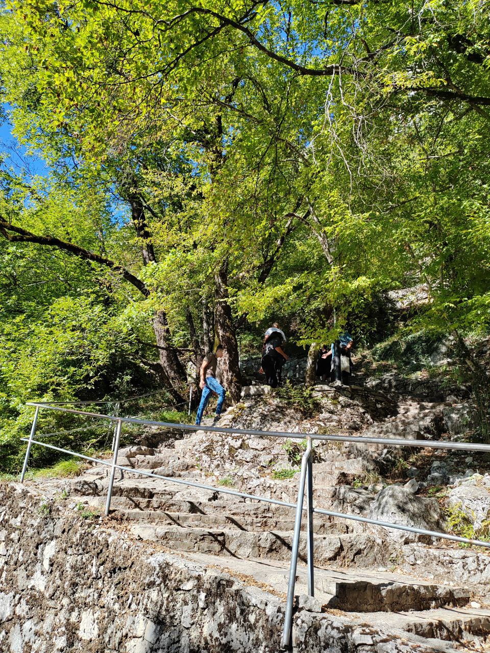 От места, где кончается автодорога, до верхнего монастыря ещё топать вверх по зигзагу лестницы на высоту, эквивалентную тридцати этажам. Тяжело, но очень живописно: мощёная ступенчатая дорога идёт через густой смешанный лес, которым зарос бок горы Острог, давшей название сооружению.