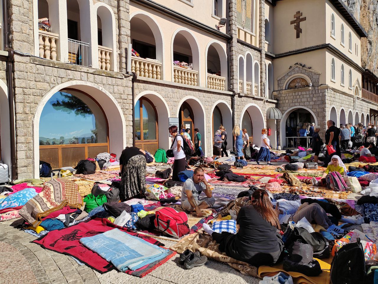 Мы попали в Острог в день какого-то крупного религиозного праздника, поэтому вся площадь и внутренний двор были застланы скитами паломников. На скитах сидели или лежали сотни людей, убежденные, что сакральность этого места улучшит настройки их жизней. По этой причине мы не попали внутрь монастыря — очередь была просто безумно длинной.
