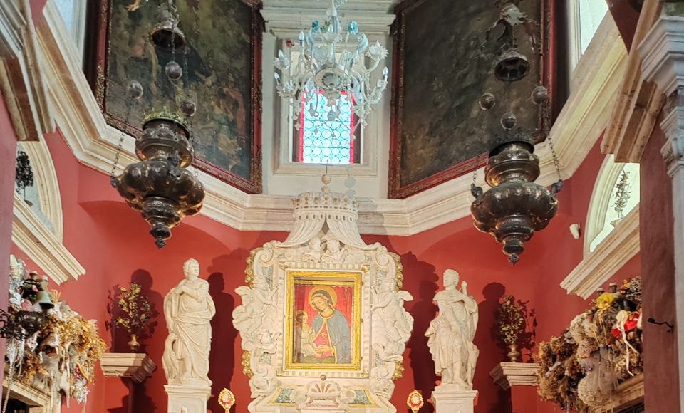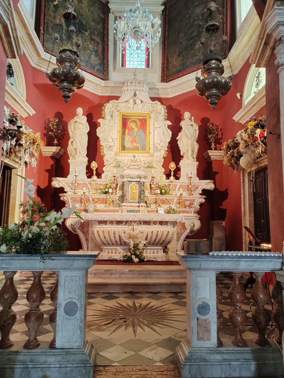 Зато здесь можно увидеть прекрасный деревянный алтарь тонкой работы греческих резчиков XIX века. В нем же хранятся ценные артефакты: кисть правой руки Иоанна Крестителя, которую весь христианский мир признает аутентичной, и фрагмент Креста Господня.