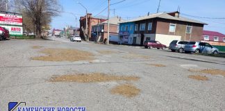 В центре Камня-на-Оби дорожные ямы заделали коричневой субстанцией