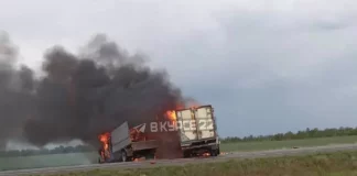 В Алтайском крае на трассе столкнулись и загорелись два грузовика