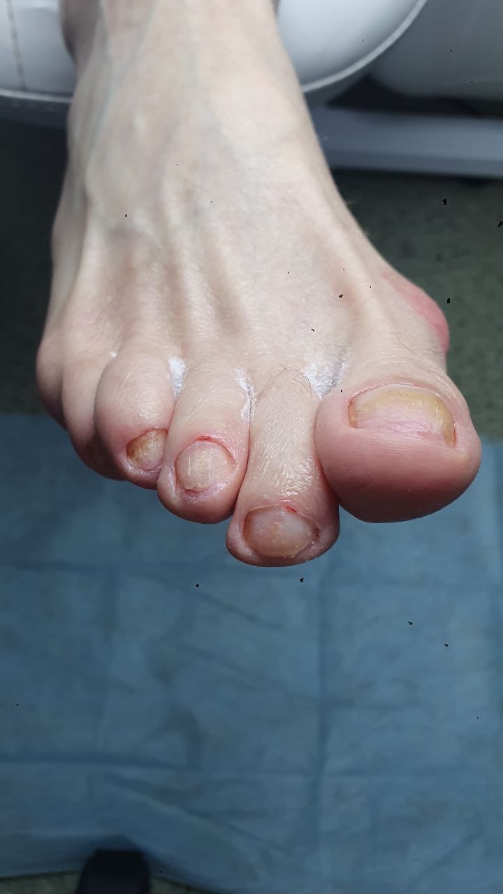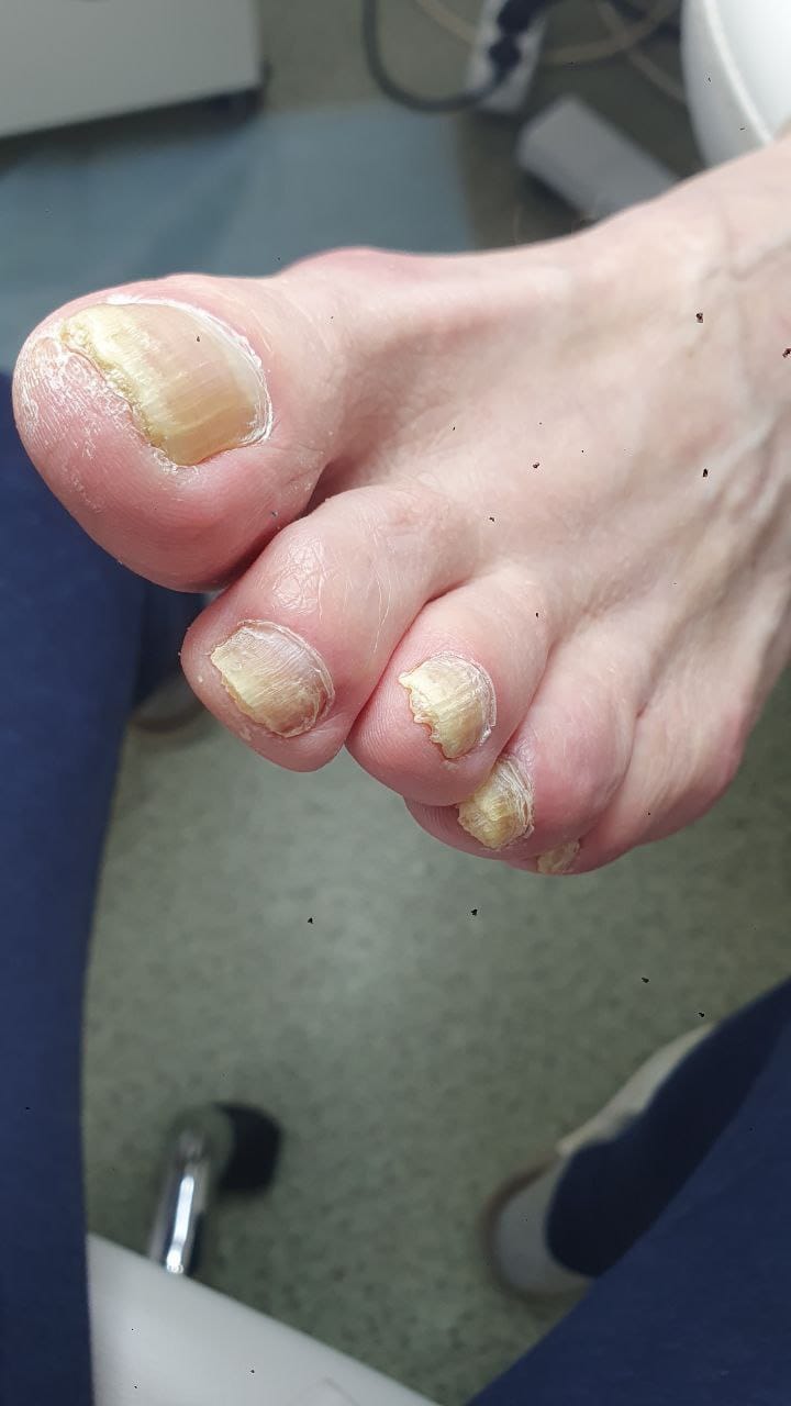 Еще одна проблема, с которой ко мне можно обратиться — это утолщение ногтя. При этом ноготь меняет свою окраску, болит. Да, многие не в курсе, но ногти имеют свойство болеть. При этом люди зачастую даже не могут их состричь, ходить очень неудобно.