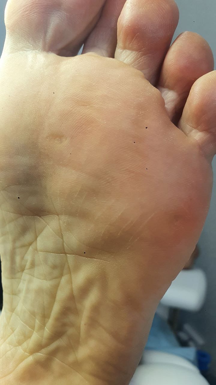 Есть еще такая вещь, как мозоли. Для нас мозоль — это волдырь. Но очень часто люди начинают ощущать будто какой-то камушек в обуви, когда его там, на самом деле, нет. В местах, где стопа испытывает сильное давление появляются сухие мозоли. И чем дальше, тем они больше и убрать их сложнее. Они спиливаются специальной фрезой. А после, на это место, как и на трещину, ставится разгрузка.